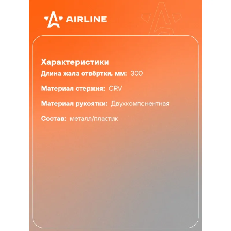 Отвертка шлицевая SL9.0x300мм, магнитный наконечник, пласт.подвес Описание: Отвертка прямая шлицевая SL9 от бренда AIRLINE многофункциональный инструмент для ремонта и строительства для машины, для дома, для дачи, для авто. Композитные рукоятки отвёрток выполнены из прочного пластика в сочетании с более мягкими резиновыми вставками в местах хвата. Такая компоновка равномерно распределяет прилагаемое усилие, обеспечивая безопасную работу для кисти и запястья. Эргономичный дизайн облегчает работу. Лезвие отвёрток AIRLINE изготовлено из хром-ванадиевой стали, жало подвержено индукционной закалке и фосфатировано. Особенности: - Магнитный наконечник; - Эргономичная ручка; - Подойдут для дома, для гаража, для любых бытовых задач, многофункциональная, для ремонта, для сборки мебели, для автомобиля; - Размер: SL9; - Длина жала отвёртки - 300 мм; - Высокая степень передачи крутящего момента от отвертки; - Материал стержня - CRV; - Материал рукоятки - двухкомпонентная, прорезиненная, стойки к воздействию масел и бензина; - Подвес инструмента; Товар официального производителя AIRLINE будет идеальным дополнение в профессиональный набор инструментов автомобилиста. Отлично подойдет в качестве практичного подарка мужчинам, женщинам, автомобилисту, папе, отцу, мужу, парню и другу на Новый год, день рождения и без повода, незаменимый строительный инструмент и оснастка сверление, долбление, закручивание для дома, автосервиса, для профессионального использования. Характеристики: Артикул: ATAW096 Размер: SL9 Длина жала отвёртки, мм: 300 Материал стержня: CRV Материал рукоятки: двухкомпонентная Комплектация: Отвертка - 1 шт Гарантия: от 1 года.