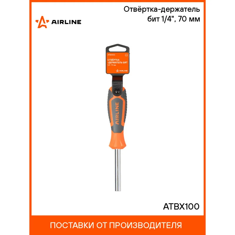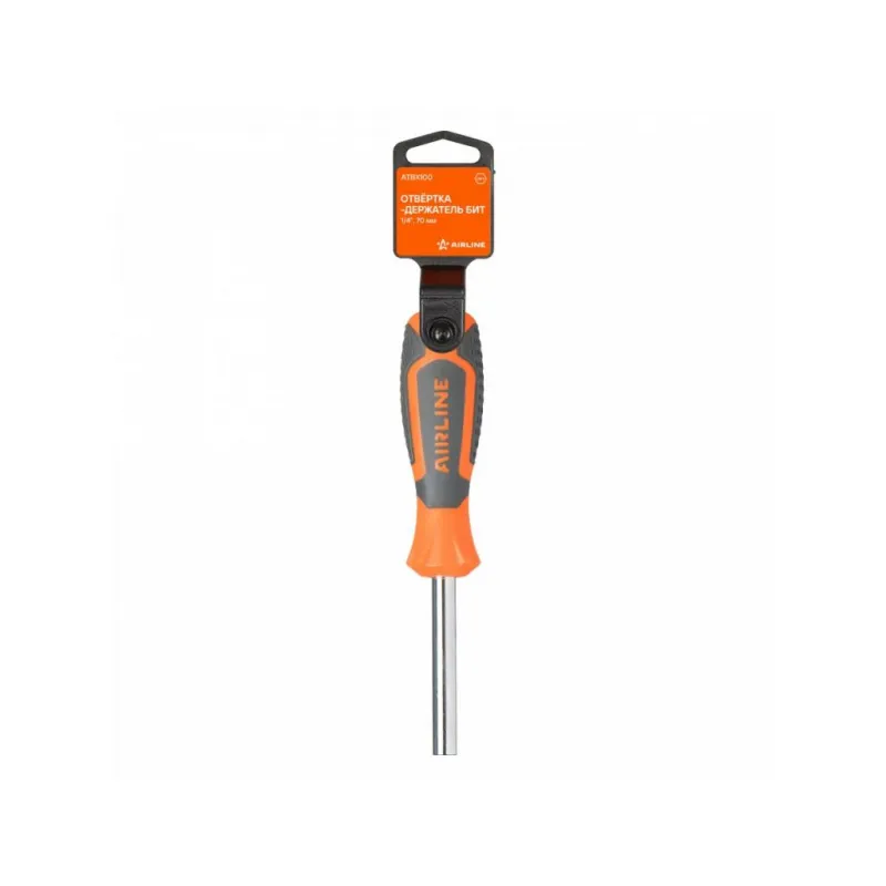 Отвёртка-держатель бит 1/4", 70 мм Описание: Сочетание твёрдых и мягких элементов рукоятки оптимально распределяет усилие, прилагаемое к инструменту, и предотвращает проскальзывание. Эргономичный дизайн облегчает работу. Отвёртки AIRLINE удобно подвешиваются за специальное отверстие. Лезвие отвёрток AIRLINE изготовлено из хром-ванадиевой стали, жало подвержено индукционной закалке и фосфатировано. Характеристики: Артикул: ATBX100 Размер: 1/4" Длина жала отвёртки, мм: 70 Материал стержня: CRV Материал рукоятки: двухкомпонентная Комплектация: Отвертка - 1 шт Гарантия: от 1 года.