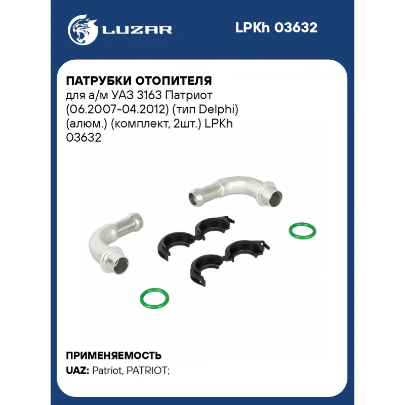 Патрубки отопителя для а/м УАЗ 3163 Патриот (06.2007-04.2012) (тип Delphi) (алюм.) (комплект, 2шт.) Характеристики: Артикул: LPKh 03632 OEM номера: 3163-00-8101083-00, 3163-8101083-00 Трансмиссия: MT/AT Кондиционер: +/- Сопутствующий товар: Радиаторы отопителя: LRh 03637 Количество на автомобиль: 1 Материал: алюминий Комплектация: трубка подводящая + отводящая, пластиковые фиксаторы Комплектация: Трубка подводящая Трубка отводящая Фиксаторы пластиковые - 2 шт Уплотнительные кольца - 2 шт Гарантия: от 1 года.