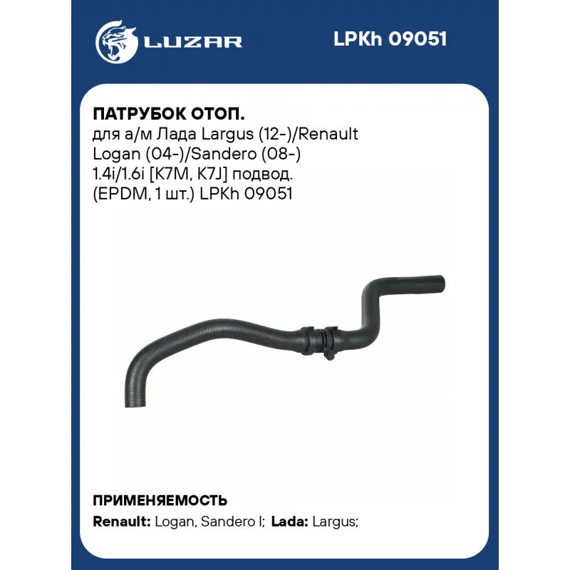 Патрубок отоп. для а/м Лада Largus (12-)/Renault Logan (04-)/Sandero (08-) 1.4i/1.6i [K7M, K7J] подвод. (EPDM, 1 шт.) Характеристики: Артикул: LPKh 09051 OEM номера: 924000807R, 6001547051 Трансмиссия: MT Кондиционер: +/- Сопутствующий товар: Радиаторы отопителя: LRh 0998 Количество на автомобиль: 1 Применяемость: K7M, K7J Сопутствующий товар: Патрубок отопителя отводящий: LPKh 09052 Материал: Резина (EPDM) армированная капроновой нитью Подходит для авто: Renault Logan (04-), Sandero I (09-) ВАЗ Largus (12-) Для проверки применяемости отправьте VIN автомобиля через вкладку "Есть вопросы о товаре?" Комплектация: Патрубок отопления подводяший (EPDM) - 1 шт Паспорт изделия. Гарантия: от 1 года.