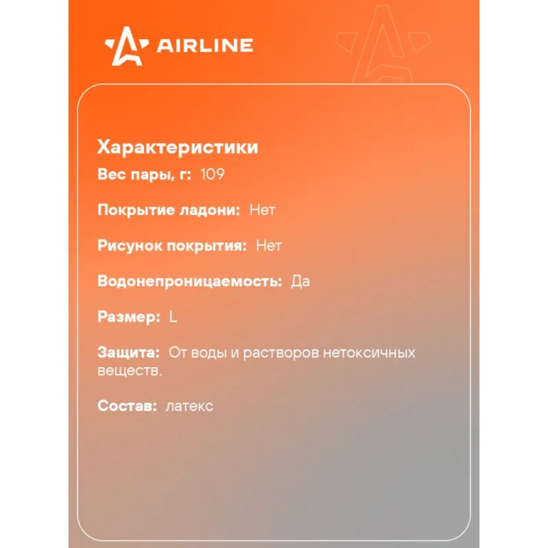 Перчатки латексные без подкладки (L), черные, с подвесом Описание: Перчатки латексные без подкладки, черные (L), AWG-LS-10 бренда AIRLINE - водостойкие и предназначены для работы с различными жидкостями. Перчатки изготовлены из особо прочного латекса, который защищает кисти рук от механических повреждений. Изделие имеет универсальный размер и черную расцветку. Особенности: - Защита - от воды и растворов нетоксичных веществ.; - Состав - латекс; - Защита рук от механических воздействий; - Высокая износоустойчивость; - Высокая тактильная чувствительность. - Многоразовые перчатки анатомической формы обеспечивают комфортное облегание ладони и пальцев рук; Товар официального производителя AIRLINE. Прочные бытовые перчатки будут хорошим приобретением, практичным подарком, автомобилисту, мужчине и женщине, автолюбителю, папе, отцу, мужу, парню и другу, пригодятся в ремонте, в быту, для уборки, для садовых и огородных работ, для работ в гараже и в строительстве, защита от агрессивного воздействия моющих средств, химических чистящих кислотных и абразивных веществ во время мытья посуды, пола, уборки комнат квартиры, кухни и ванны. Выбирайте подходящую модель перчаток согласно вашему запросу и учитывая особенности перчаток. В нашем магазине, вы найдете широкий ассортимент высококачественных автотоваров для автомобиля, аксессуары для машины, автомобильные наборы в машину, резиновые сверхпрочные хозяйственные перчатки для уборки; перчатки кожаные, нитриловые, нейлоновые, полиэфирные, трикотажные, акриловые и другое. Характеристики: Артикул: AWG-LS-10 Вес пары, г: 109 Покрытие ладони: нет Рисунок покрытия: нет Водонепроницаемость: да Размер: L Защита: от воды и растворов нетоксичных веществ. Комплектация: Перчатки - 1 пар Картонное навершие - 1 шт Гарантия: от 1 года.