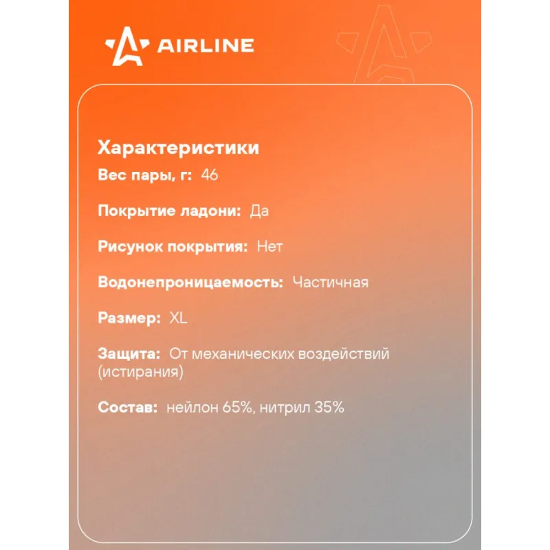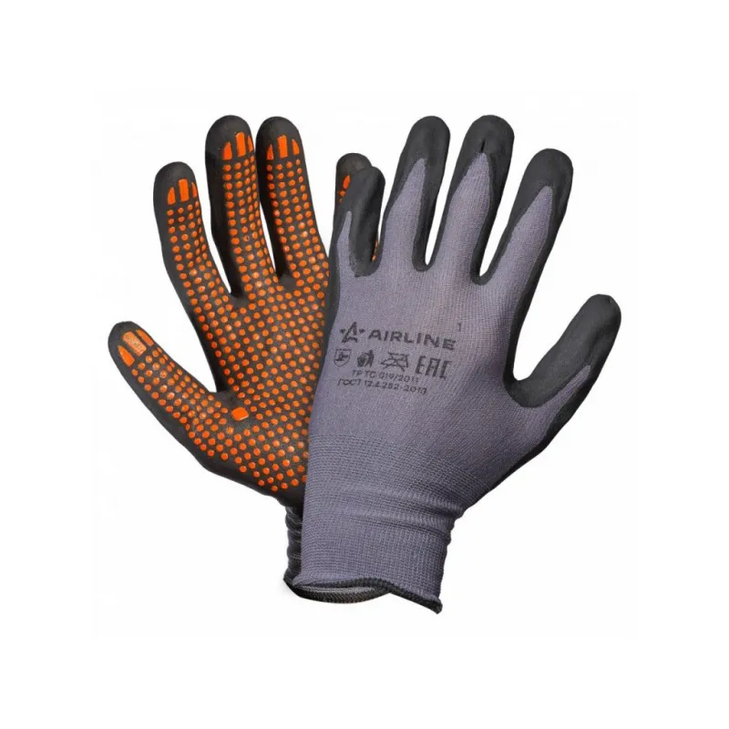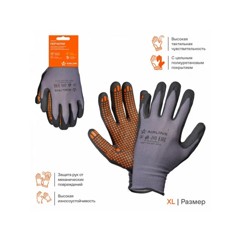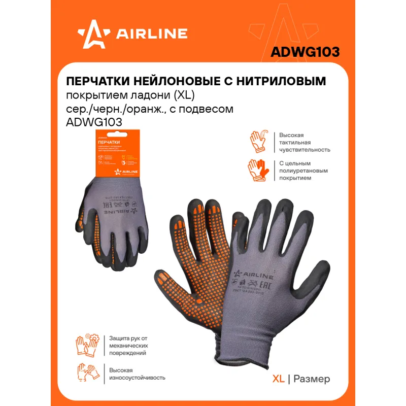 Перчатки нейлоновые с нитриловым покрытием ладони (XL) сер./черн./оранж., с подвесом Описание: Перчатки нейлоновые с нитриловым покрытием ладони (XL), черные/оранжевые ADWG103 бренда AIRLINE применяются для защиты кистей рук от загрязнения, механических повреждений. Нейлоновые перчатки отличаются не только высокими показателями прочности, но и особой структурой ткани, которая дает возможность оставаться пальцам чувствительными. Рабочие защитные перчатки подойдут для работы с малогабаритными деталями и мелкими механизмами. Перчатки изготовлены из тонкого нейлона и пропитаны нитрилом черного цвета в области ладони и пальцев. Для улучшения антискользящих свойств на нитрильное покрытие дополнительно нанесено точечное пвх покрытие. Используются в быту и на производстве требующем высокой точности движений. Особенности: - Защита - от механических воздействий (истирания); - Состав - нейлон 65%, нитрил 35%; - С цельным полиуретановым покрытием; - Защита рук от механических воздействий и повреждений; - Высокая износоустойчивость; - Высокая тактильная чувствительность. - Многоразовые перчатки анатомической формы обеспечивают комфортное облегание ладони и пальцев рук; Товар официального производителя AIRLINE. Прочные бытовые перчатки будут хорошим приобретением, практичным подарком, автомобилисту, мужчине и женщине, автолюбителю, папе, отцу, мужу, парню и другу, пригодятся в ремонте, в быту, для уборки, для садовых и огородных работ, для работ в гараже и в строительстве, защита от агрессивного воздействия моющих средств, химических чистящих кислотных и абразивных веществ во время мытья посуды, пола, уборки комнат квартиры, кухни и ванны. Выбирайте подходящую модель перчаток согласно вашему запросу и учитывая особенности перчаток. В нашем магазине, вы найдете широкий ассортимент высококачественных автотоваров для автомобиля, аксессуары для машины, автомобильные наборы в машину, резиновые сверхпрочные хозяйственные перчатки для уборки; перчатки кожаные, нитриловые, нейлоновые, полиэфирные, трикотажные, акриловые и другое. Характеристики: Артикул: ADWG103 Вес пары, г: 46 Покрытие ладони: да Рисунок покрытия: нет Водонепроницаемость: частичная Размер: XL Защита: от механических воздействий (истирания) Комплектация: Перчатки - 1 пар Картонное навершие - 1 шт Гарантия: от 1 года.