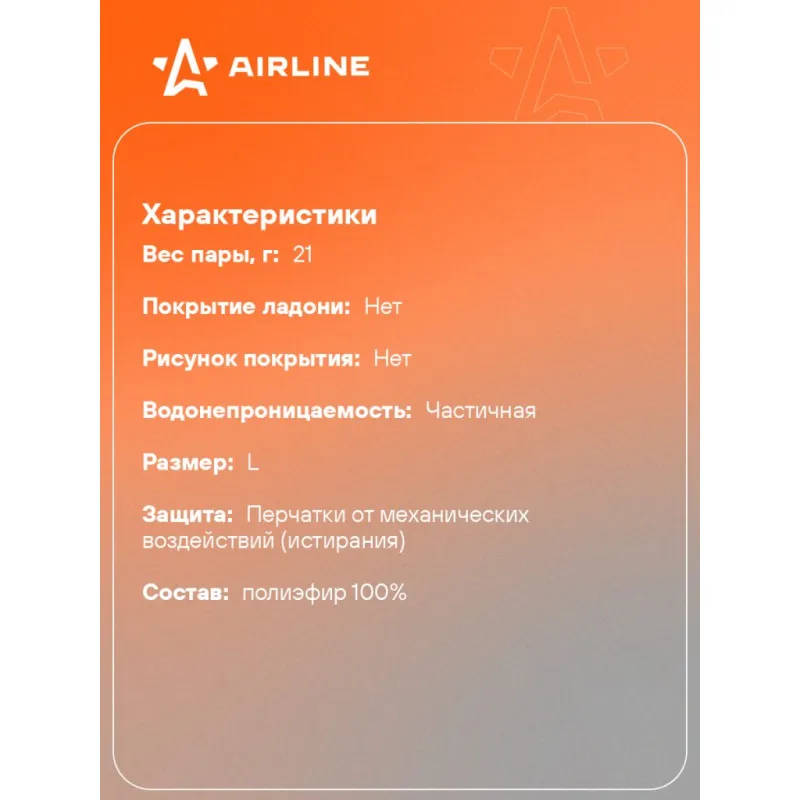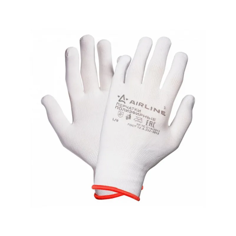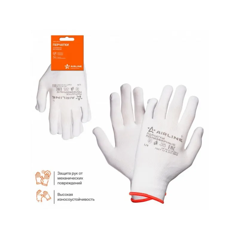 Перчатки полиэфирные (L), белые, с подвесом Описание: Перчатки рабочие, полиэфирные, защитные (L), белые, AWG-NS-12 бренда AIRLINE - применяются для защиты кистей рук от загрязнения, механических повреждений. Перчатки изготовлены из тонкого 100% полиэфира белого цвета, схожего с нейлоном. Перчатки отлично облегают руку, что повышает чувствительность и позволяет работать с мелкими предметами. Особенности: - Защита - перчатки от механических воздействий (истирания); - Состав - полиэфир 100%; - Защита рук от механических воздействий; - Высокая износоустойчивость; - Высокая тактильная чувствительность. - Многоразовые перчатки анатомической формы обеспечивают комфортное облегание ладони и пальцев рук; Товар официального производителя AIRLINE. Прочные перчатки будут хорошим приобретением, практичным подарком, автомобилисту, мужчине и женщине, автолюбителю, папе, отцу, мужу, парню и другу, пригодятся в ремонте, в быту, для уборки, для садовых и огородных работ, для работ в гараже и в строительстве, защита от агрессивного воздействия моющих средств, химических чистящих кислотных и абразивных веществ во время мытья посуды, пола, уборки комнат квартиры, кухни и ванны. Выбирайте подходящую модель перчаток согласно вашему запросу и учитывая особенности перчаток. В нашем магазине, вы найдете широкий ассортимент высококачественных автотоваров для автомобиля, аксессуары для машины, автомобильные наборы в машину, резиновые сверхпрочные хозяйственные бытовые перчатки для уборки; перчатки кожаные, нитриловые, нейлоновые, полиэфирные, трикотажные, акриловые и другое. Характеристики: Артикул: AWG-NS-12 Вес пары, г: 21 Покрытие ладони: нет Рисунок покрытия: нет Водонепроницаемость: частичная Размер: L Защита: перчатки от механических воздействий (истирания) Комплектация: Перчатки - 1 пар Картонное навершие - 1 шт Гарантия: от 1 года.