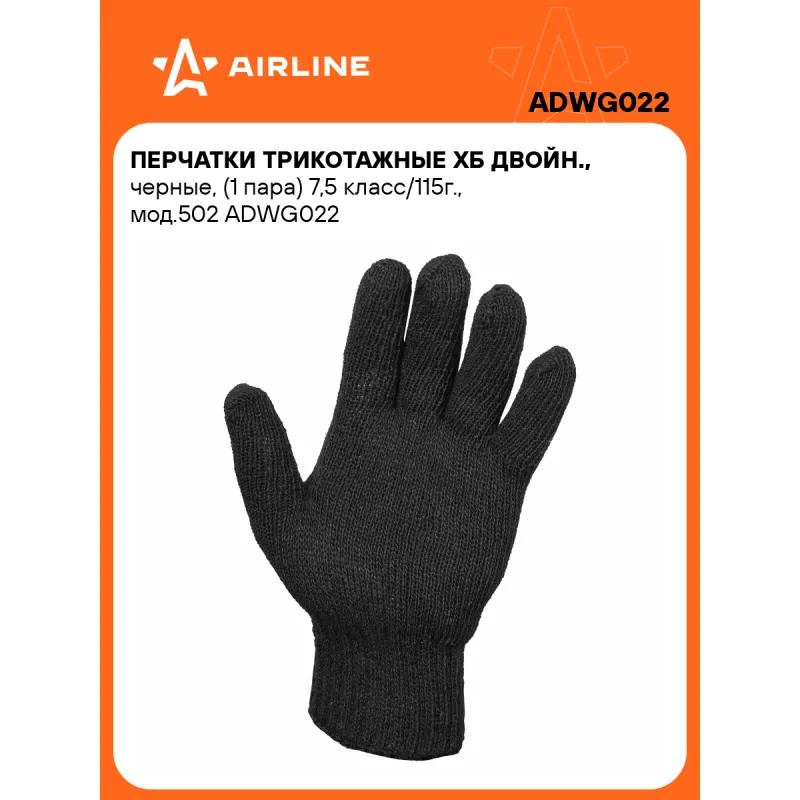 Перчатки трикотажные ХБ двойн., черные, (1 пара) 7,5 класс/115г., мод.502 Описание: Данная модель перчаток сочетает в себе демократичную цену и гарантированные качественные показатели. Перчатки связаны из ХБ нитей. Изделие обладает высоким порогом износа, что обеспечивает возможность длительной эксплуатации. Перчатки предназначены для защиты рук от механических повреждений при выполнении работ на производстве, в строительстве и в быту. Характеристики: Артикул: ADWG022 Вес пары, г: 115 Количество нитей: 4 Класс вязки: 7,5 Полтность, текс: 400 Покрытие ладони: нет Рисунок покрытия: нет Водонепроницаемость: нет Размер: XL Защита: от механических повреждений (истирания, проколы, порезы) Комплектация: Перчатки - 1 пар Гарантия: от 1 года.