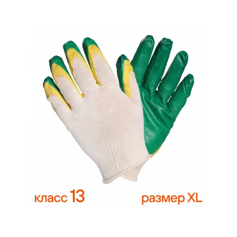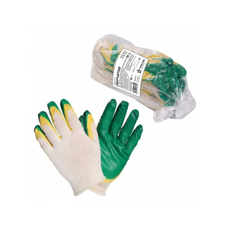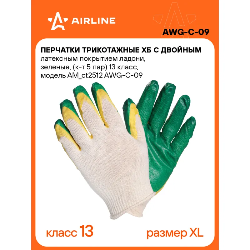 Перчатки трикотажные ХБ с двойным латексным покрытием ладони, зеленые, (к-т 5 пар) 13 класс, модель AM_ct2512 Описание: Перчатки трикотажные ХБ с двойным латексным покрытием ладони, рабочие, защитные трикотажные двойные (XL), AWG-C-09 бренда AIRLINE - предназначены для защиты рук от загрязнений и механических повреждений на производстве, строительстве, сельскохозяйственных работах и домашнем быту. Двойное латексное покрытие ладони перчаток обеспечивает хорошее сцепление с инструментом, предотвращая проскальзывание рук во время работы, а также защищают ладони от воды и маслянистых жидкостей. Особенности: - Защита - от механических повреждений (истирания, проколы, порезы); - Класс вязки - 13; - Состав - хб-85%, пэ-15%, латекс; - Защита рук от механических воздействий; - Высокая износоустойчивость; - Высокая тактильная чувствительность. - Многоразовые перчатки анатомической формы обеспечивают комфортное облегание ладони и пальцев рук; Товар официального производителя AIRLINE. Прочные перчатки будут хорошим приобретением, практичным подарком, автомобилисту, мужчине и женщине, автолюбителю, папе, отцу, мужу, парню и другу, пригодятся в ремонте, в быту, для уборки, для садовых и огородных работ, для работ в гараже и в строительстве, защита от агрессивного воздействия моющих средств, химических чистящих кислотных и абразивных веществ во время мытья посуды, пола, уборки комнат квартиры, кухни и ванны. Выбирайте подходящую модель перчаток согласно вашему запросу и учитывая особенности перчаток. В нашем магазине, вы найдете широкий ассортимент высококачественных автотоваров для автомобиля, аксессуары для машины, автомобильные наборы в машину, резиновые сверхпрочные хозяйственные бытовые перчатки для уборки; перчатки кожаные, нитриловые, нейлоновые, полиэфирные, трикотажные, акриловые и другое. Характеристики: Артикул: AWG-C-09 Вес пары, г: 42 Класс вязки: 13 Покрытие ладони: да Рисунок покрытия: нет Водонепроницаемость: частичная Размер: XL Защита: от механических повреждений (истирания, проколы, порезы) Комплектация: Перчатки - 5 пар ПЭ пакет - 1 шт Гарантия: от 1 года.