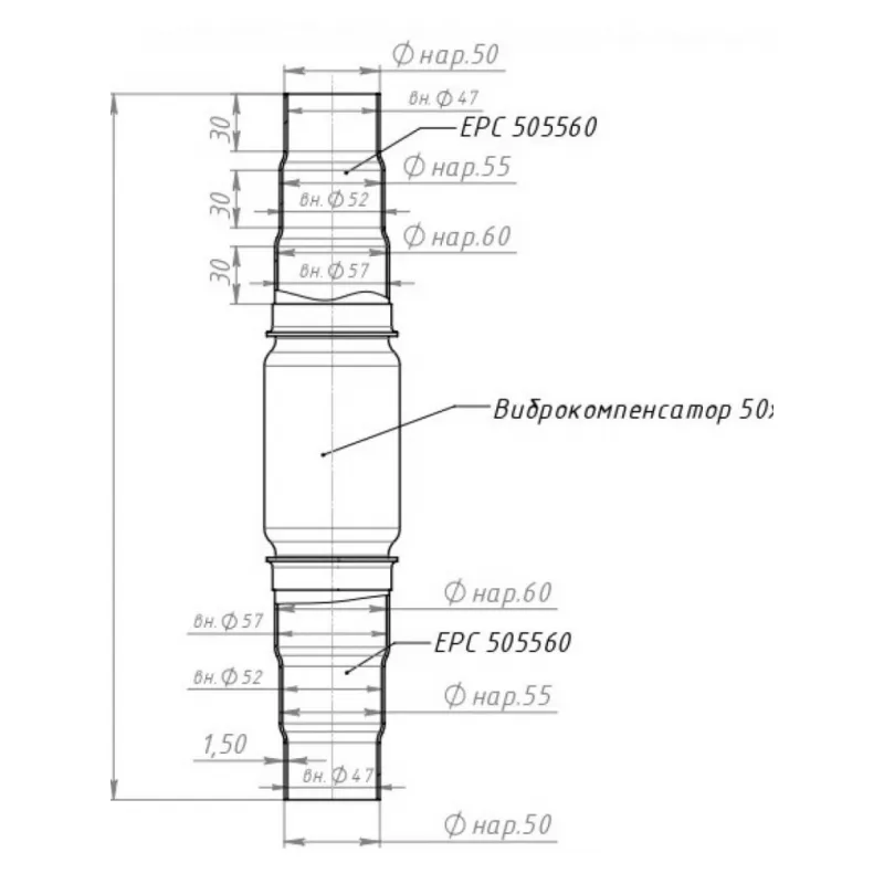Переходник ступенчатый 50/55/60 L=350 с виброкомпенсатором 50х150 (нержавеющая алюминизированная сталь) Характеристики: Артикул: EPC 505560-50150 OEM номера: 2505147010, 1742022110, 1710422120, 1741022560, 171040D100, 174100D330, 28710-A0150, 28650-A0150, 28610-A0100, 28610-M0150, 28650-M0150, 28710-M0100, 28710-M0150, 8200916974, 8200906479, 200100277R, 8200916976 Количество на автомобиль: 1 Тип конструкции: InnerBraid Гарантийный срок: 2 года/60 тыс. Длина изделия (мм): 370 Размер виброкомпенсатора ID/NL, мм: 50х150 Под трубу диаметром D-1, мм: 50-51 Под трубу диаметром D-2, мм: 54-55 Под трубу диаметром D-3, мм: 59-60,3 Материал: Нержавеющая сталь марки AISI 201 Товарная линейка: BLACK Дополнительная информация: Этикетка изделия может отличаться от представленной на фото Комплектация: Переходник ступенчатый с виброкомпенсатором - 1 шт Гарантия: от 1 года.