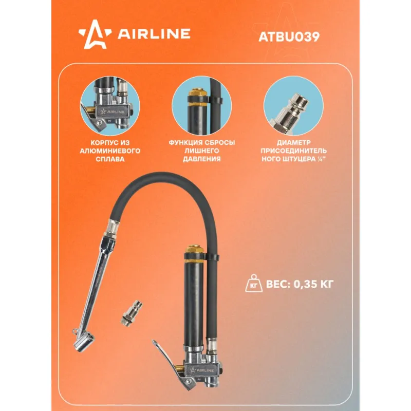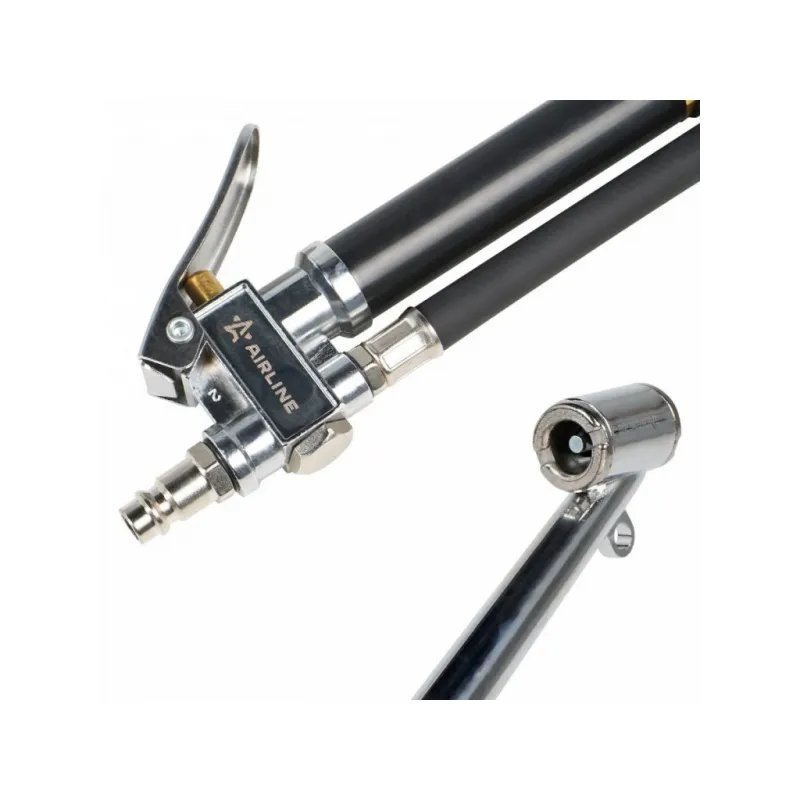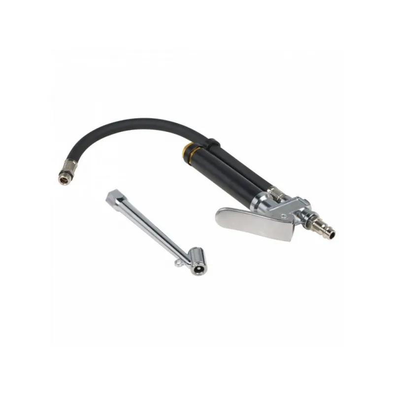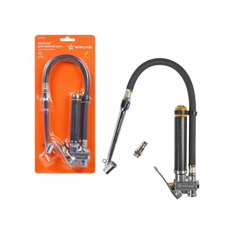 Пистолет для накачки шин без манометра грузовой Описание: Пистолет для подкачки шин грузовой AIRLINE ATBU039 предназначен для накачки шин и контроля давления в шинах. Корпус пистолета выполнен из алюминиевого сплава. Гибкий шланг имеет быстросъёмный наконечник. Конструкцией предусмотрена функция для сброса лишнего давления. В комплект входит присоединительный фитинг 1/4". Преимущества: Максимальное рабочее давление - 8 атм; Рекомендуется использовать очки и специальные перчатки при работе с пистолетом. Порядок использования: 1 Присоединить к пистолету линию подачи сжатого воздуха; 2 Присоединить наконечник к вентилю колеса; 3 Нажать на клапан до упора для подачи сжатого воздуха в колесо; 4 Нажать на боковой клапан для стравливания лишнего воздуха; 5 Контролировать давление воздуха в колесе по показаниям манометра, отпустив клапан. Пистолет для накачки шин, пневмопистолет, может быть использован в бытовых и профессиональных условиях, в автомастерских, шиномонтажных мастерских, станциях технического обслуживания (СТО) автомобилей и мототехники. Характеристики: Артикул: ATBU039 Максимальное рабочее давление, атм: 8 Комплектация: Пистолет - 1 шт Гарантия: от 1 года.