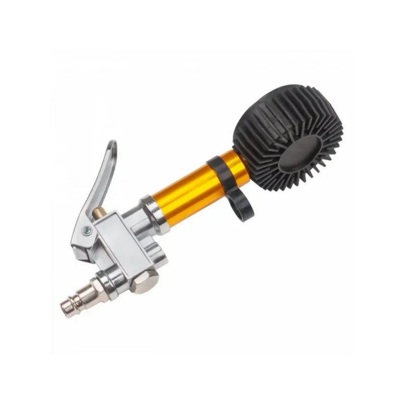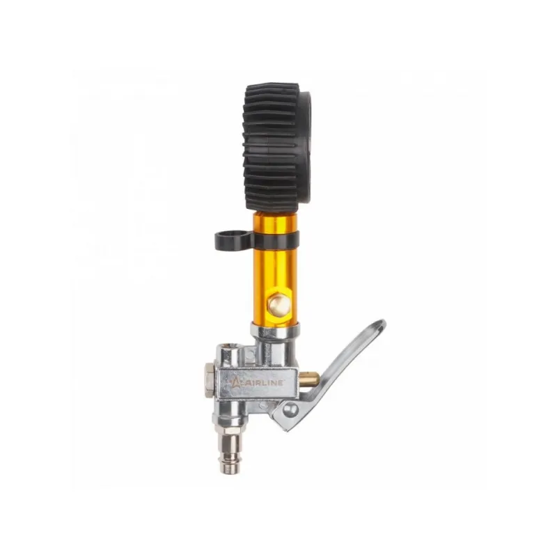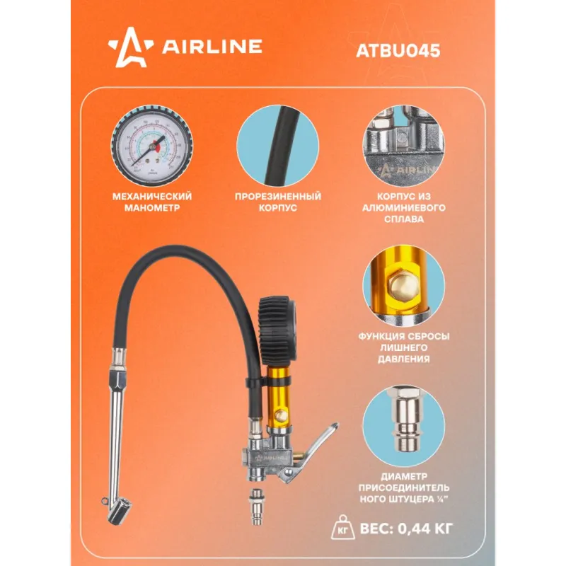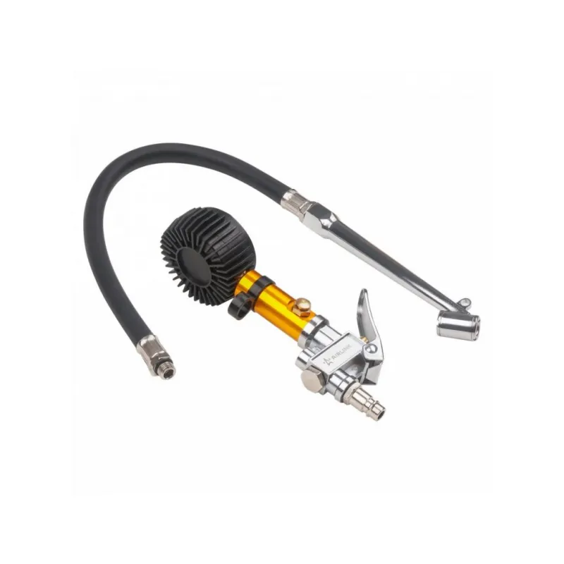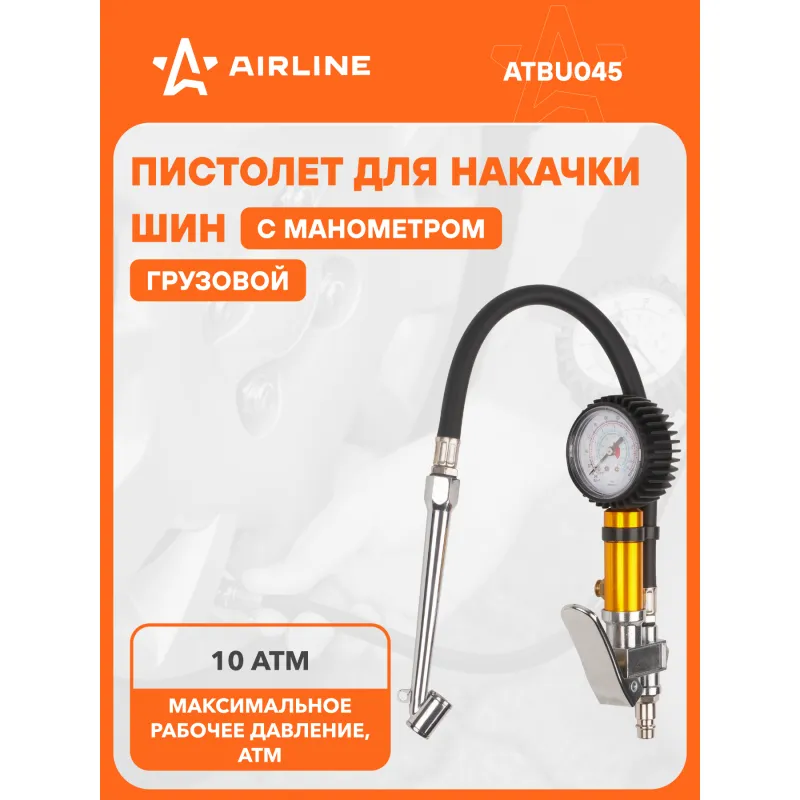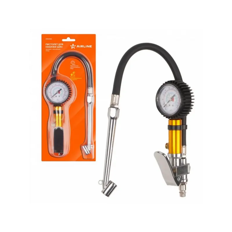 Пистолет для накачки шин грузовой 15 АТМ с манометром Описание: Пистолет для подкачки шин грузовой с манометром AIRLINE ATBU045 предназначен для накачки шин и контроля давления в шинах. Корпус пистолета выполнен из алюминиевого сплава. Гибкий шланг имеет быстросъёмный наконечник. Конструкцией предусмотрена функция для сброса лишнего давления. В комплект входит присоединительный фитинг 1/4". Преимущества: Максимальное рабочее давление - 10 атм; Длина шланга с наконечником - 46 см; Рекомендуется использовать очки и специальные перчатки при работе с пистолетом. Порядок использования: 1 Присоединить к пистолету линию подачи сжатого воздуха; 2 Присоединить наконечник к вентилю колеса; 3 Нажать на клапан до упора для подачи сжатого воздуха в колесо; 4 Нажать на боковой клапан для стравливания лишнего воздуха; 5 Контролировать давление воздуха в колесе по показаниям манометра, отпустив клапан. Пистолет для накачки шин, пневмопистолет, может быть использован в бытовых и профессиональных условиях, в автомастерских, шиномонтажных мастерских, станциях технического обслуживания (СТО) автомобилей и мототехники. Характеристики: Артикул: ATBU045 Максимальное рабочее давление, атм: 10 Длина шланга с наконечником, см: 46 Комплектация: Пистолет - 1 шт Гарантия: от 1 года.