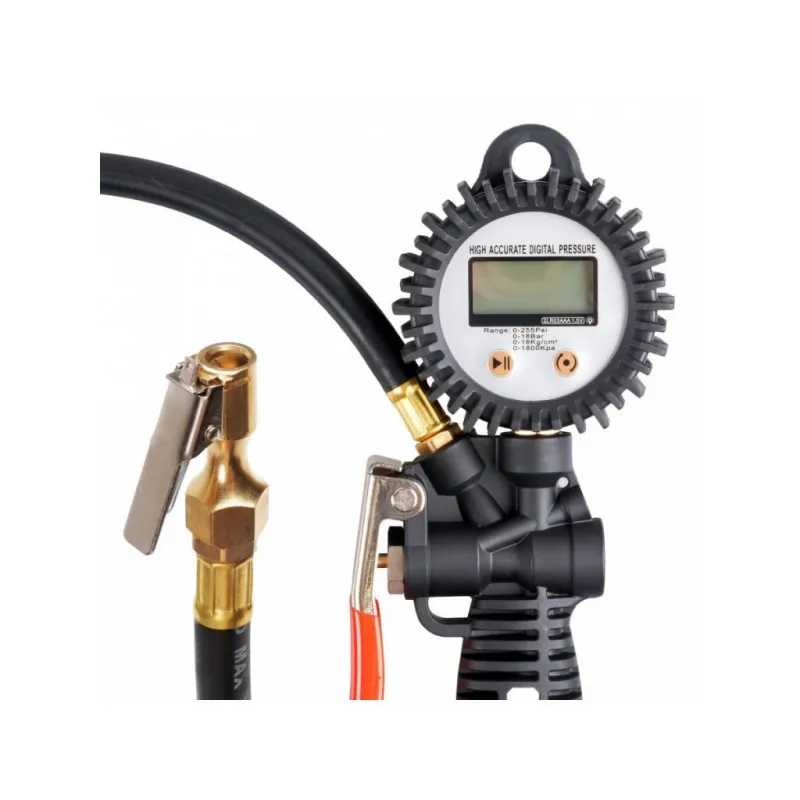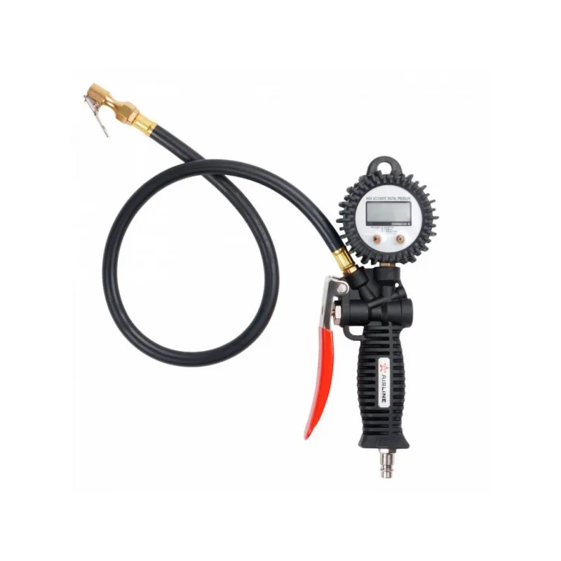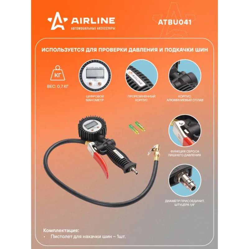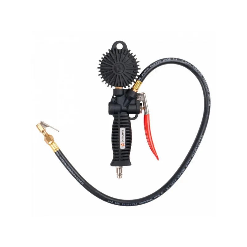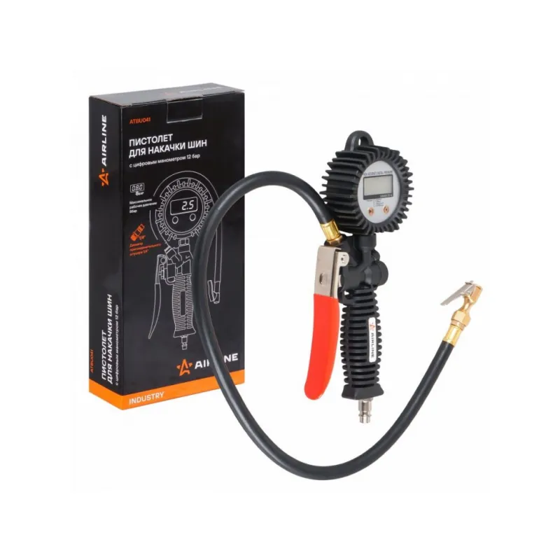 Пистолет для накачки шин 12 АТМ INDUSTRY с цифровым манометром Описание: Пистолет для подкачки шин с цифровым манометром AIRLINE ATBU041 предназначен для накачки шин и контроля давления в шинах. Корпус пистолета изготовлен из нейлона. Манометр защищён резиновым чехлом. Гибкий шланг имеет быстросъёмный наконечник. Конструкцией предусмотрена функция для сброса лишнего давления. В комплект входит присоединительный фитинг 1/4". Преимущества: Максимальное рабочее давление - 8 атм; Длина шланга с наконечником - 44 см; Рекомендуется использовать очки и специальные перчатки при работе с пистолетом. Порядок использования: 1 Присоединить к пистолету линию подачи сжатого воздуха; 2 Присоединить наконечник к вентилю колеса; 3 Нажать на клапан до упора для подачи сжатого воздуха в колесо; 4 Нажать на боковой клапан для стравливания лишнего воздуха; 5 Контролировать давление воздуха в колесе по показаниям манометра, отпустив клапан. Пистолет для накачки шин, пневмопистолет, может быть использован в бытовых и профессиональных условиях, в автомастерских, шиномонтажных мастерских, станциях технического обслуживания (СТО) автомобилей и мототехники. Характеристики: Артикул: ATBU041 Максимальное рабочее давление, атм: 8 Длина шланга с наконечником, см: 44 Комплектация: Пистолет - 1 шт Гарантия: от 1 года.