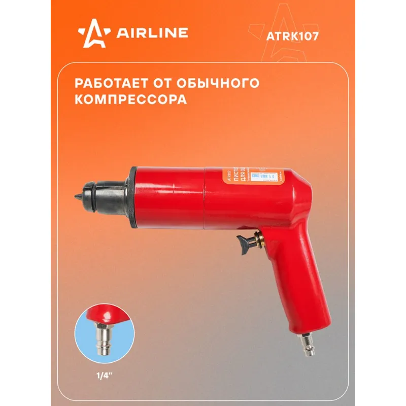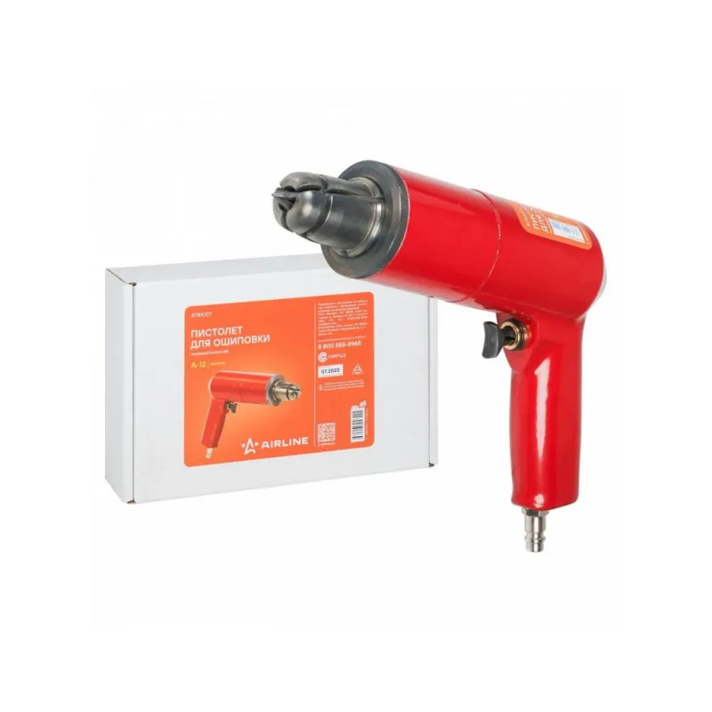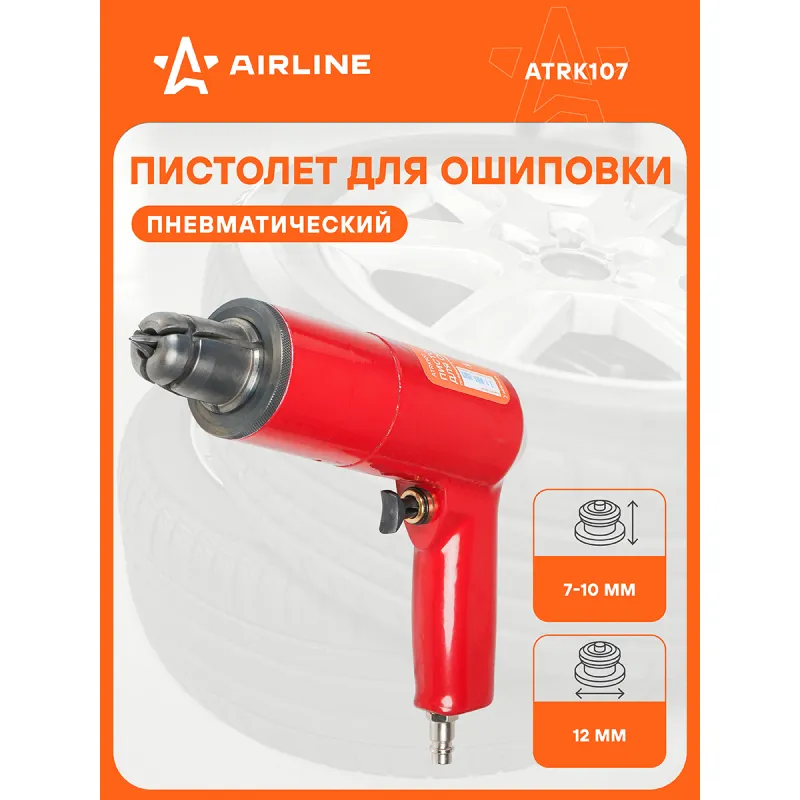 Пистолет для ошиповки пневматический А-12 Описание: Пистолет предназначен для ошиповки зимних шин ремонтными шипами, шиповальный пистолет, пневмо пистолет. Работает от обычного компрессора. Эффективное рабочее давление от 8 до 10 атм. Шипы подаются непосредственно в головную часть пистолета по одной штуке за раз. Для удобной ошиповки рекомендуется использовать мыльный раствор воды с нейтральным pH. После использования пистолета важно полностью высушить все металлические детали. Чтобы предотвратить образование коррозии, рекомендуем нанести силиконовую смазку или индустриальное масло И-20 на головную часть и посадочное место. Оригинальный товар от производителя Airline. Дополнительно можно приобрести шипы ремонтные бренда Airline. Характеристики: Артикул: ATRK107 Вес, кг: 1,66 Ширина, мм: 180 Длина, мм: 250 Высота, мм: 60 Диаметр фрланца ремонтного шипа, мм: 12 Диаметр впускного отверстия, дюйм: 1/4 Рабочее давление min, Bar: 6 Рабочее давление max, Bar: 8 Высота ремонтного шипа min, мм: 7 Высота ремонтного шипа max, мм: 10 Комплектация: Пистолет пневматический - 1 шт Паспорт - 1 шт Коробка - 1 шт Гарантия: от 1 года.