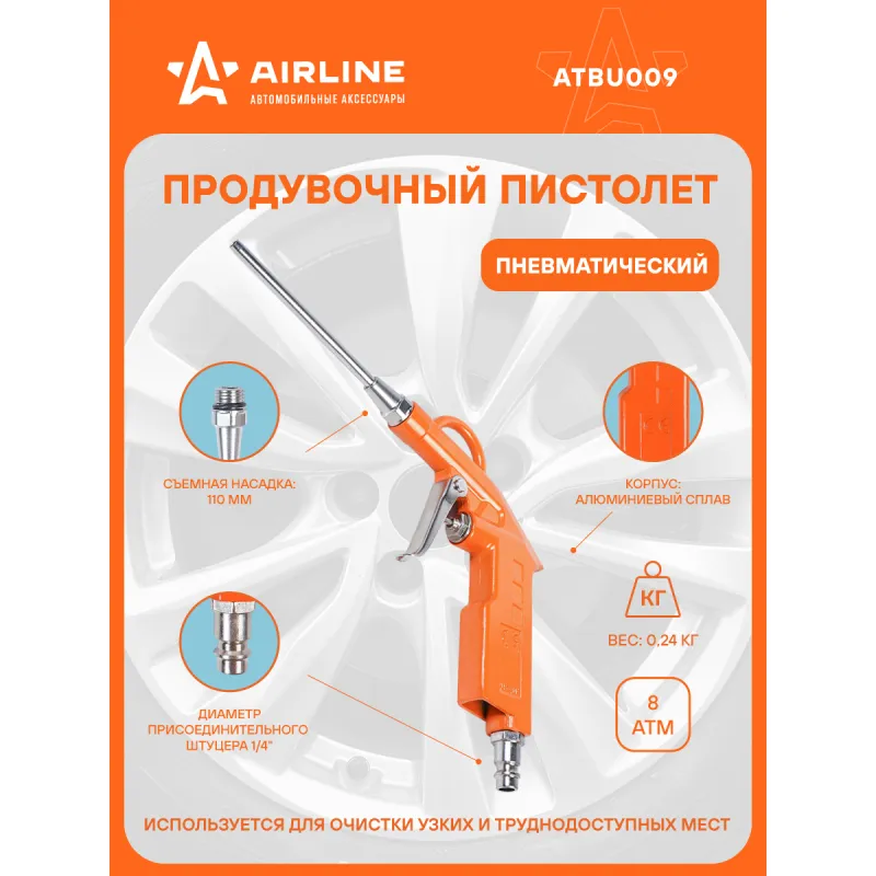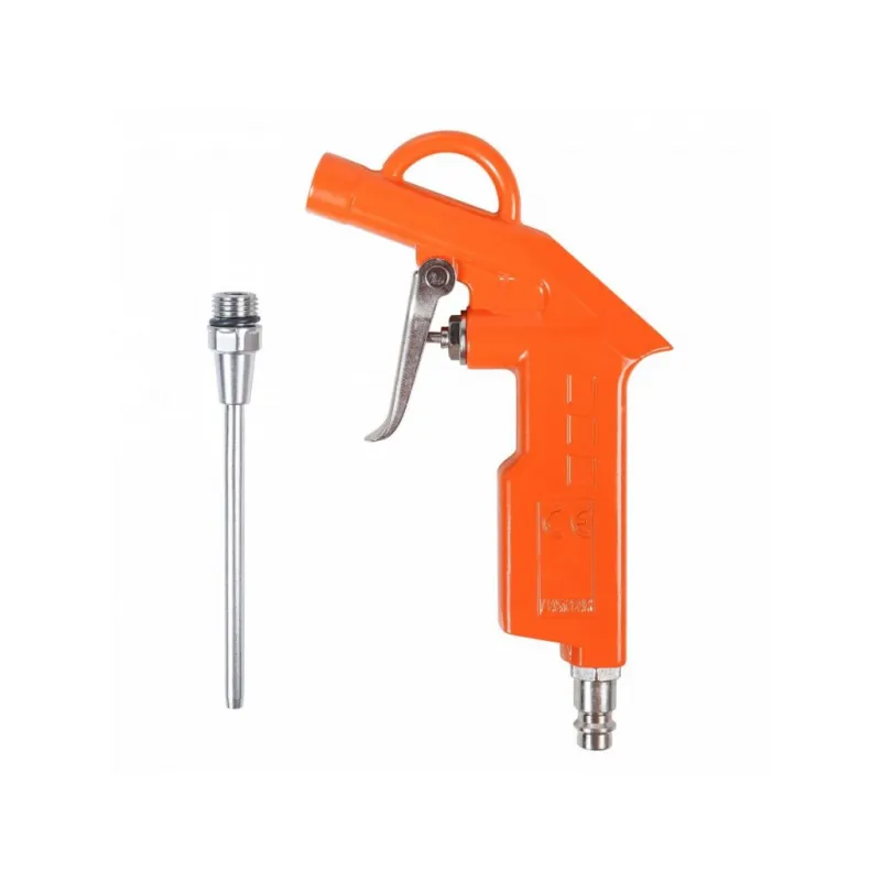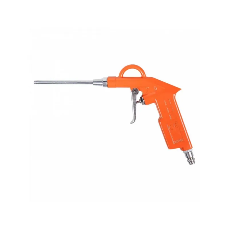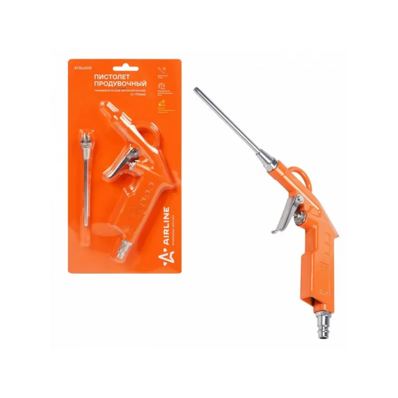 Пистолет продувочный пневматический металл. L=110мм Описание: Корпус продувочного пистолета изготовлен из алюминиевого сплава. В комплект входит присоединительный фитинг 1/4". Характеристики: Артикул: ATBU009 Диаметр присоединительного штуцера: 1/4" Длина сопла, мм: 110 Комплектация: Пистолет продувочный - 1 шт Гарантия: от 1 года.