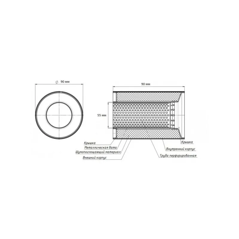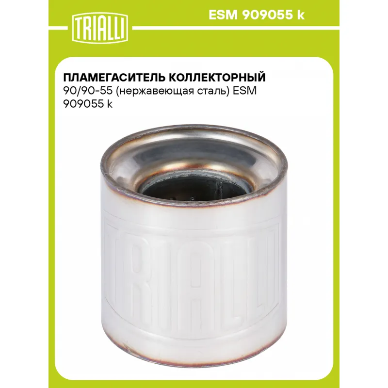 Пламегаситель коллекторный 90/90-55 (нержавеющая сталь) Характеристики: Артикул: ESM 909055 k OEM номера: 90x90 Количество на автомобиль: 1 Особенности конструкции:: Труба перфорированная, шерсть нержавеющая, набивка жаро-шумопоглощающая Гарантийный срок: 2 года/60 тыс. Длина, мм: 90 Диаметр корпуса, мм: 90 Диаметр перфор. трубы... Читать полностью →