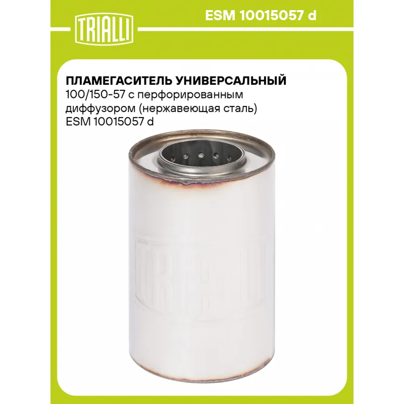 Пламегаситель универсальный 100/150-57 с перфорированным диффузором (нержавеющая сталь) Характеристики: Артикул: ESM 10015057 d OEM номера: 10015057 d Материал: Нержавеющая сталь AISI 430 Особенности конструкции:: Труба перфорированная с диффузором, шерсть нержавеющая, набивка жаро-шумопоглощающая Длина, мм: 150 Диаметр корпуса,... Читать полностью →
