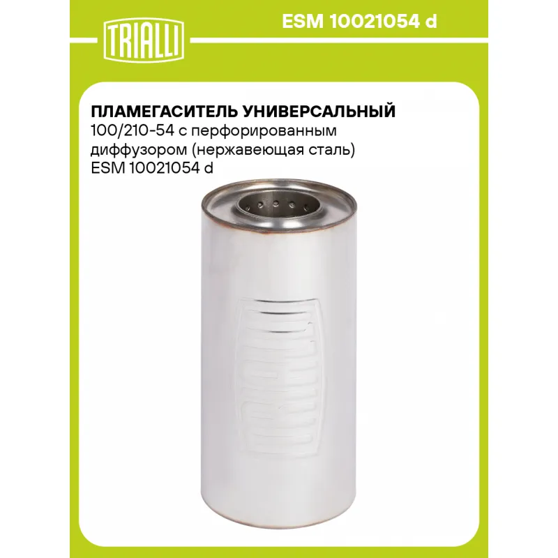Пламегаситель универсальный 100/210-54 с перфорированным диффузором (нержавеющая сталь) Характеристики: Артикул: ESM 10021054 d OEM номера: 10021054 d Материал: Нержавеющая сталь AISI 430 Особенности конструкции:: Труба перфорированная с диффузором, шерсть нержавеющая, набивка жаро-шумопоглощающая Длина, мм: 210 Диаметр корпуса,... Читать полностью →