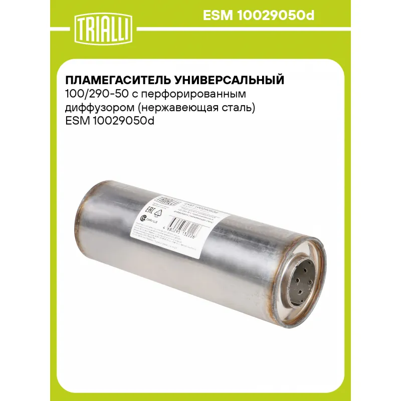 Пламегаситель универсальный 100/290-50 с перфорированным диффузором (нержавеющая сталь) Характеристики: Артикул: ESM 10029050d OEM номера: 2505147010, 1742022110, 1710422120, 1741022560, 171040D100, 174100D330, 28710-A0150, 28650-A0150, 28610-A0100, 28610-M0150, 28650-M0150, 28710-M0100, 28710-M0150, 8200916974, 8200906479, 200100277R, 8200916976, 200101KA0A, 203001KA0A, 201001KA0A, 2505147070, 20010JD000, 20100JD00A, 2851026430, 286101G300, 287001G300, 287301G400, 171040D031, 1741022310, 1743022320, 174022140, 174600D050, 1742022010, 1743022120, 174101A480, 1742016720, 174301D010, 1746022010, B08A0BM701, 200105M370, 20300BM500, 20100BM520, B08A0-AU000, 20010BN805, 20300BN800, 20300BN810, 20010BN815, 203005M770, 286102E150, 28950337630, 286502E170, 287001F120, 285102BPF2, 286102Y500, 286502Y500, 287003U500, 286102S100, 289602G900, 286502S100, 287002Y100, 286102S300, 286502S300, 287002Y300, 28610-2E100, 2895037630, 286502E151, 28700-2E151, 286502E651, 287002E350, 289902F000, 14002JD90A, 20010JD200, 20100BR20A, 1741037320, 1742037040, 1743037371, 2505126020, 1741026400, 1743026743, 2505126080, 1714137100, 1714037321, 1742037120, 1743037521, 2505126130, 1741026470, 2505128340, 1741028582, 1742028712, 1743037372, 20010JD20B, 208A0JG10B, 20010BR40A, 20100JD71B, 1583A028, 1570A519, MR552606, MR993500, 1570A842, 1570B175, 1571A703, MN156051, 52039793, 94763377, 94763374, 20010-95F0B, 2001095F0C, 20300-95F0D, 20300-95F0C, 20300-95F0F, 20100-95F0A, 20100-95F0D, 28990-2A690, 28990-2A830, 28610-A2800, 28600-A2870, 28600-A2800, 2001000Q1A, 20010-00Q1J, 20010-00Q1K, Z6Y32050XC, Z6682050XA, Z60440300B, 1K0254505RX, 1K0254511LX, 1K0253209EN, 1K0253209J, 1K5253609, 1K0254500BX, 28610-C9100, 28650-M0100, K0254510X, 1K0253209BJ, 1Z3253609AE, 1K0253209CS, 1K5253609E, 1Z0253609AE, 1KO254303NX, 1F0254401FX, 1K0253209K, 28510-2B420, 285102B460, 28610-1H000, 28700-1H000, 289402A780, 28610-2L510, 28950-2A630, 28700-1H500, 1570A743, 1570B110, 1571A930, 1J0254502QX, 1J0253209, 1J5253609C, 1570B161, 1570B443, 28510-22BIH0, 28610-1H150, 28700-1H370, 28700-1H170, 1741028551, 1742028470, 1743028720, 28610-C9200, 28610-M0200, 28610-M0250, 28710-M0200, 28710-M0250, 17410-0V390, 17420-0V340, 17430-0V340, 20010JG02A, 20100JG05A, 208A0JD50A, 20100JG70A, 18190r07e00, 18210-SWY-E11, 18160-R07-E00, 18220-SWY-E01, 18307-SWY-E01, 2851023820, 28610-2E100, 28950-23756, 28650-2E120, 28700-2E120, 28650-2E150, 28700-2E151, 17410-0H450, 17420-36120, 17430-36170, 1570A94, 1570A094, 1570A837, 1571A622, 140029Y920, 200108H70A, 200188H70A, 203008H31A, 201008H70A, 1742028320, 1743028510, 1K0254510X, 18160RZPG00, 18210SWWE01, 18210-S10A01, 18160-P3FG10, 18160PHKG00, 18220-S10A03, 18030-S10A00, MN180083, MN156565, MN180617, 1570B398, 1571B053, 357253409C Количество на автомобиль: 1 Особенности конструкции:: Труба перфорированная с диффузором и шумопоглощающий материал Гарантийный срок: 2 года/60 тыс. Длина, мм: 290 Диаметр корпуса, мм: 100 Диаметр перфор. трубы (мм): 52 Материал: Нержавеющая сталь AISI 439 Товарная линейка: BLACK Комплектация: Пламегаситель с перфорированным диффузором - 1 шт Гарантия: от 1 года.