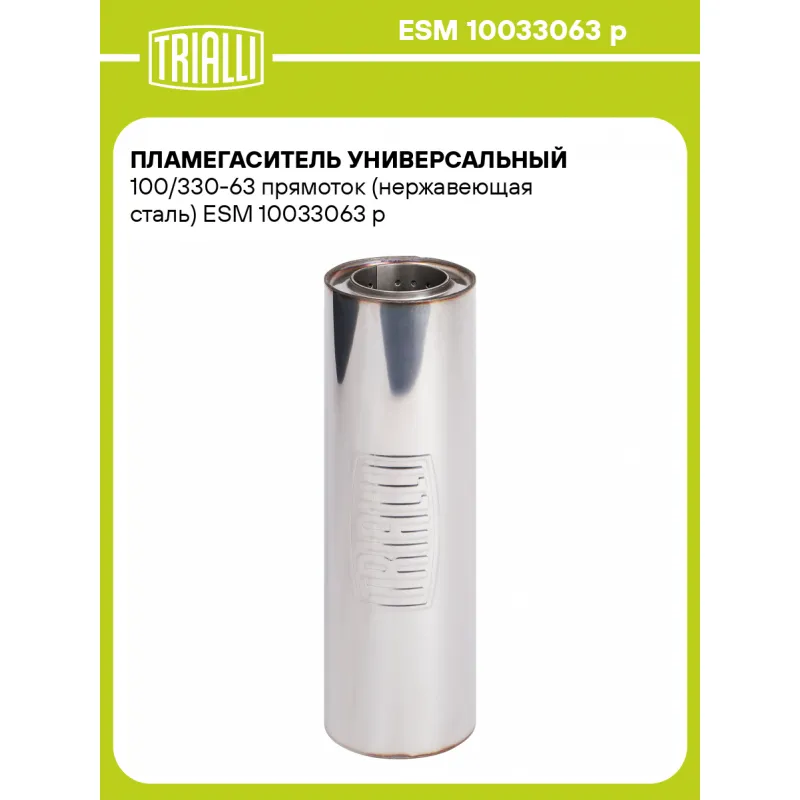 Пламегаситель универсальный 100/330-63 прямоток (нержавеющая сталь) Характеристики: Артикул: ESM 10033063 p OEM номера: 10033063 p Материал: Нержавеющая сталь AISI 430 Особенности конструкции:: Труба перфорированная, шерсть нержавеющая, набивка жаро-шумопоглощающая Длина, мм: 330 Диаметр корпуса, мм: 100 Гарантийный срок: 2 года... Читать полностью →