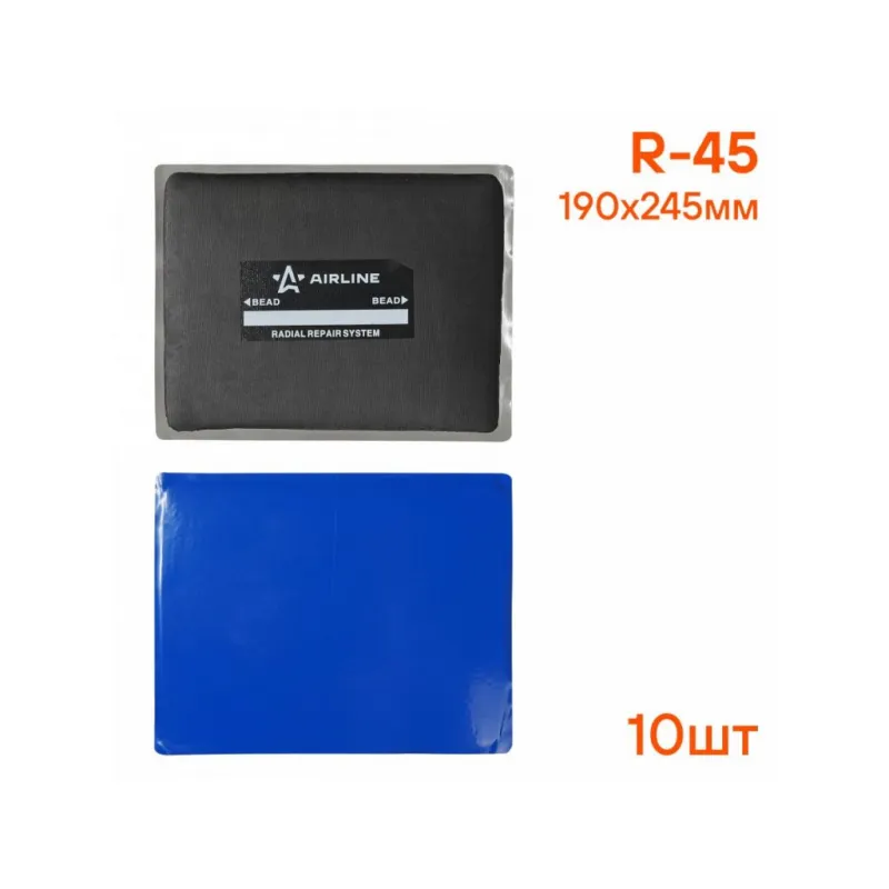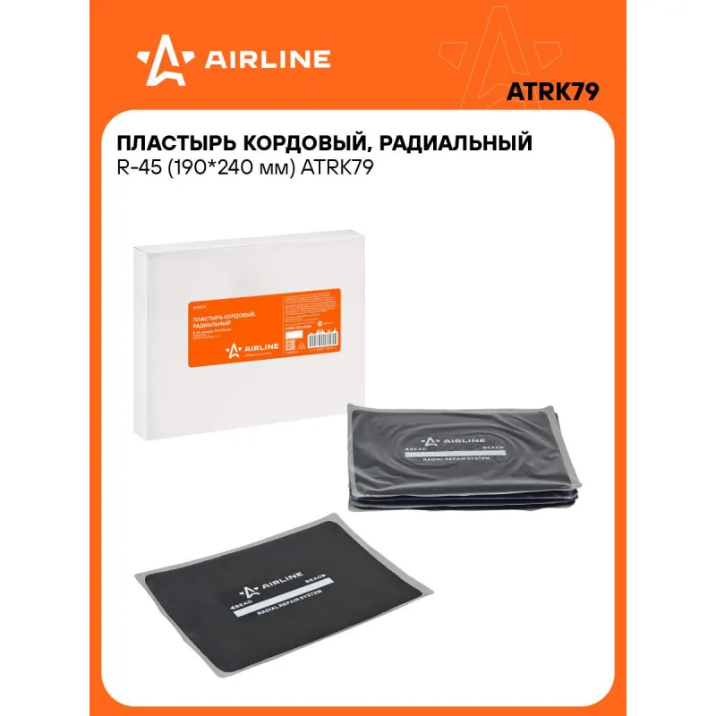 Пластырь кордовый, радиальный R-45 (190*240 мм) Описание: Радиальные пластыри предназначены для ремонта всех типов радиальных бескамерных и камерных шин легковых автомобилей, грузового и пассажирского транспорта, велосипедов, мотоциклов, сельскохозяйственной, карьерной и землеройной техники. Они обеспечивают надежный и долговечный ремонт в любой ремонтопригодной зоне шины. Размер пластыря должен быть примерно в три раза больше повреждения. Набор из пластырей входит в базовым комплект необходимых автомобильных инструментов. Оригинальный товар от производителя Airline. В случае возникновения вопросов, наши специалисты с радостью ответят на них в разделе "Вопросы". Характеристики: Артикул: ATRK79 Длина, мм: 240 Ширина, мм: 190 Форма: Прямоугольная Слои корда: 4 Тип вулканизации: Холодная Комплектация: Пластырь кордовый радиальный для б/к шин, ремонтный, для холодной вулканизации - 1 шт Гарантия: от 1 года.