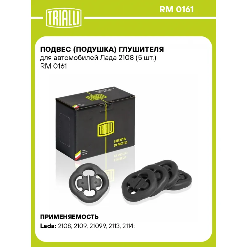 Подвес (подушка) глушителя для автомобилей Лада 2108 (5 шт.) Характеристики: Артикул: RM 0161 OEM номера: 2108-1203073, 21011203073, 2101120307320, 2108-1203073-20, 823253147, 96351182, 191253147B, 4A0253147, 4A0253147A, 817253147, 823253147A, 893253147D, S191253147B Гарантийный срок: 2 года/60 тыс. Материал: Резина Товарная линейка: BLACK Количество деталей в артикуле, шт.: 5 Подходит для авто: ВАЗ 2115, 2114, 2113, 21099, 21099, 2109, 2108, 2115, 2114, 2113, 21099, 21099, 2109, 2109, 2108, 2108 Для проверки применяемости отправьте VIN автомобиля через вкладку "Есть вопросы о товаре?" Комплектация: Подушка глушителя - 5 шт Гарантия: от 1 года.