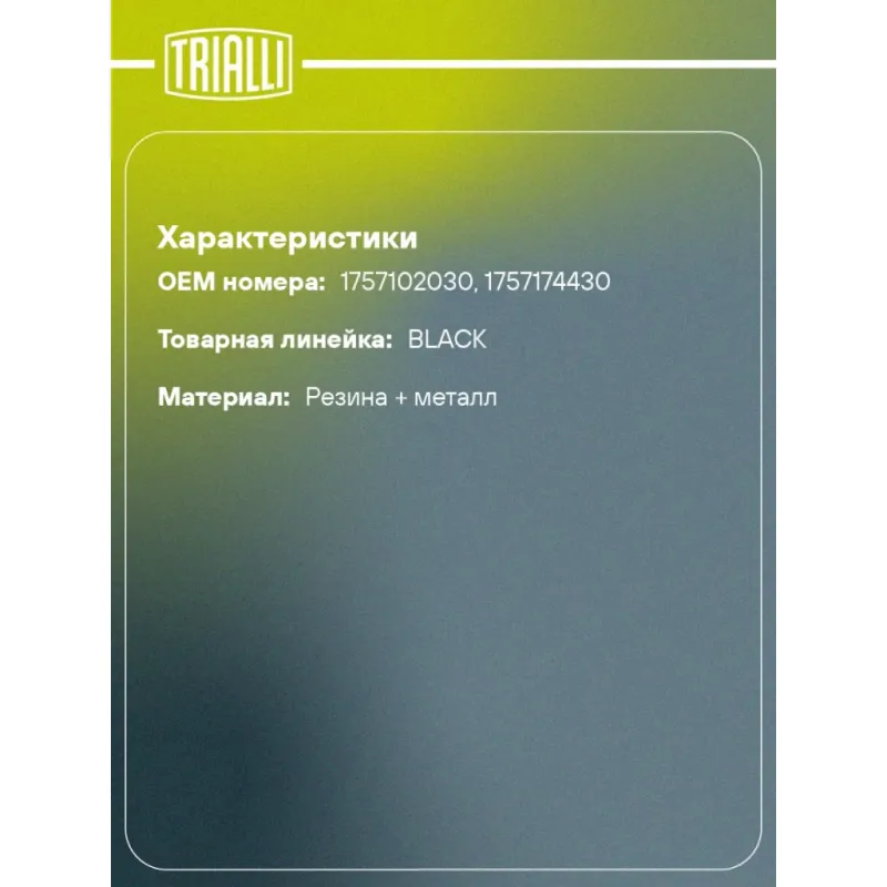Подвес (подушка) глушителя для автомобилей Nissan/Toyota (1 шт.) Характеристики: Артикул: RM 0210 OEM номера: 1757102030, 1757174430 Материал: Резина + металл Гарантийный срок: 2 года/60 тыс. Товарная линейка: BLACK Комплектация: Подвес глушителя - 1 шт Гарантия: от 1 года.