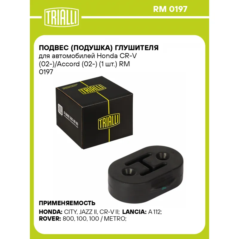 Подвес (подушка) глушителя для автомобилей Honda CR-V (02-)/Accord (02-) (1 шт.) Характеристики: Артикул: RM 0197 OEM номера: 18215S5DA01, 18215SZ5003, 18215S84A11, 18215S84A20, 18215SA0000, 18215SB3920, 18215SG9000, 18215SV1000, 18215SV4000, 18215671003, 20651-69A00, 96460427, GEX7689, GEX7616 Гарантийный срок: 2 года/60 тыс. Материал: Резина Товарная линейка: BLACK Комплектация: Подвес глушителя - 1 шт Гарантия: от 1 года.