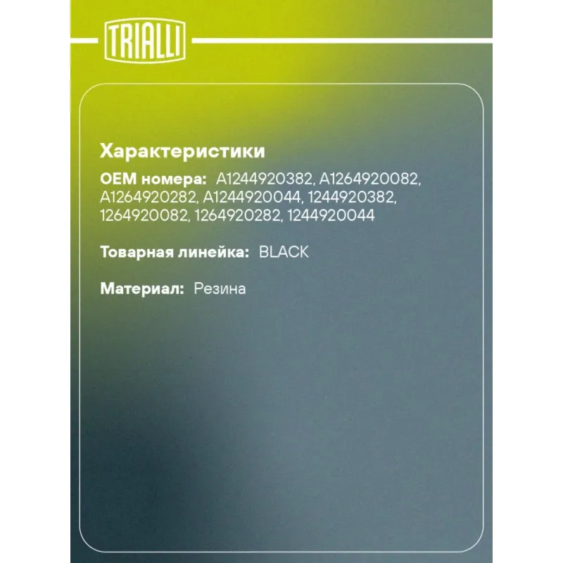 Подвес (подушка) глушителя для автомобилей Mercedes E W124 (84-) (1 шт.) Характеристики: Артикул: RM 0174 OEM номера: A1244920382, A1264920082, A1264920282, A1244920044, 1244920382, 1264920082, 1264920282, 1244920044 Гарантийный срок: 2 года/60 тыс. Материал: Резина Товарная линейка: BLACK Комплектация: Подвес глушителя - 1 шт Гарантия: от 1 года.