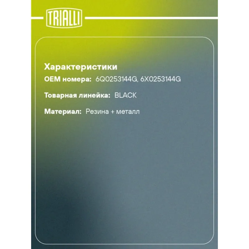 Подвес (подушка) глушителя для автомобилей Skoda Fabia (99-)/VW Polo (01-) (1 шт.) Характеристики: Артикул: RM 0187 OEM номера: 6Q0253144G, 6X0253144G Материал: Резина + металл Гарантийный срок: 2 года/60 тыс. Товарная линейка: BLACK Комплектация: Подвес глушителя - 1 шт Гарантия: от 1 года.