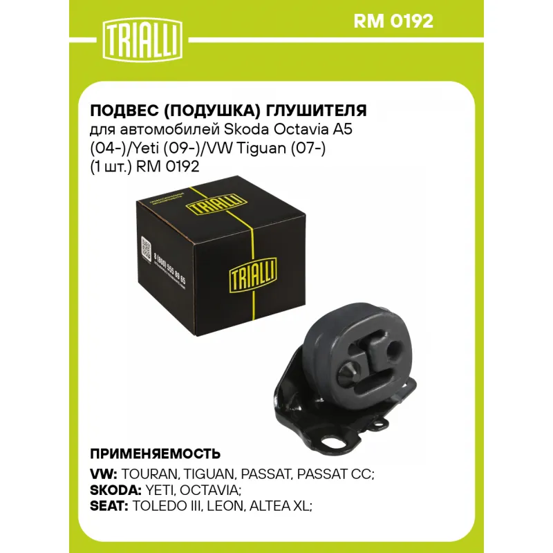 Подвес (подушка) глушителя для автомобилей Skoda Octavia A5 (04-)/Yeti (09-)/VW Tiguan (07-) (1 шт.) Характеристики: Артикул: RM 0192 OEM номера: 20651BM410, 1K0253144AK Материал: Резина + металл Гарантийный срок: 2 года/60 тыс. Товарная линейка: BLACK Комплектация: Подвес глушителя - 1 шт Гарантия: от 1 года.