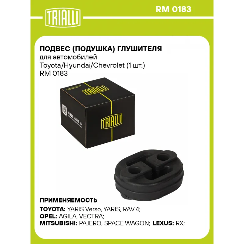 Подвес (подушка) глушителя для автомобилей Toyota/Hyundai/Chevrolet (1 шт.) Характеристики: Артикул: RM 0183 OEM номера: 1756787703, 60655991, LF4640061, MB376954, MB577484, MB612148, MB906128, MB612366, 2065150A00, 20650-70A10, 20650-70A65, 20651-50A01, 20650-69A00, 94581747, 9208560, 94580156, 1755P7, 744031060, 1428160G00, 1428160G10, 1428170H00, 1428179010, 1428180JA0, 1428184A00, 1428278000, 1428278010, 14209M78020, 175650M010, 175650D020, 1750511010, 1750564011, 1750564030, 175620J010, 1756507050, 1756563120, 1756574210, 1756574280, 1756574290, 1756576030, 1757211020, 1756546010, 1756555020, 1756563020, 1756563030, 1756563060, 1756563071, 1756511160, 1756515010, 1756515020, 1756515140, 1756516020, 1756516080, 1756335020, 1756501010, 1756501030, 175650D060, 1756511010, 1756511030, 94841685, 96051783, 2865826000, 1756520050, 1756521030, 2876822000, 96316782, 96144305, J1756335020, J1756535010 Гарантийный срок: 2 года/60 тыс. Материал: Резина Товарная линейка: BLACK Комплектация: Подвес глушителя - 1 шт Гарантия: от 1 года.