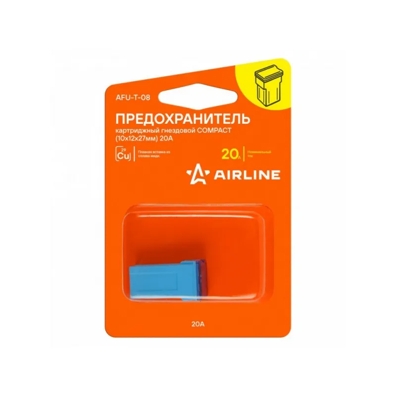 Предохранитель картриджный гнездовой COMPACT (10x12x27мм) 20А в блистере 1шт. Описание: Картриджный предохранитель гнездовой COMPACT. Предназначен для защиты автомобильных электрических цепей и устройств в них от перегрузок и короткого замыкания. В предохранителях использована вставка из высококачественного сплава меди, которая в случае нештатной ситуации разомкнет неисправную электрическую цепь. Также внутри предохранителя для надежной фиксации его элементов используется керамический уплотнитель. Применяется преимущественно в иномарках. Благодаря своей надежности и долговечности предохранители AIRLINE обеспечивают безопасносную эксплуатацию автомобиля и позволяют избежать поломок, связанных с перегрузками или короткими замыканиями. Предохранитель для иномарок имеет стандартный типоразмер и легко устанавливается в штатное место в блоке предохранителей без необходимости специальных знаний и инструментов. Используйте предохранители AIRLINE для надежной защиты вашего автомобиля. Характеристики: Артикул: AFU-T-08 OEM номера: 3818838, 8971836430, MU001091, MU840031, 24370-C9911, 24370-79927, 24370-C9910, 82211FC030, 90982-08280, 90982-08283, 9609306030, 918204A000, 18980-04824, 9182622000, 91830-38000, 918304A000, N 911 863 03, 96377977, 96584144, 13133860 Номинальное напряжение, В: 32 Номинальный ток, А: 20 Комплектация: Предохранитель - 1 шт Упаковка - 1 шт Гарантия: от 1 года.