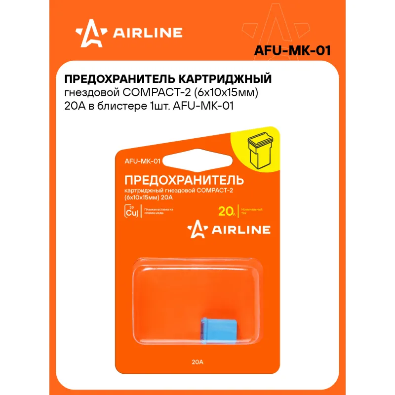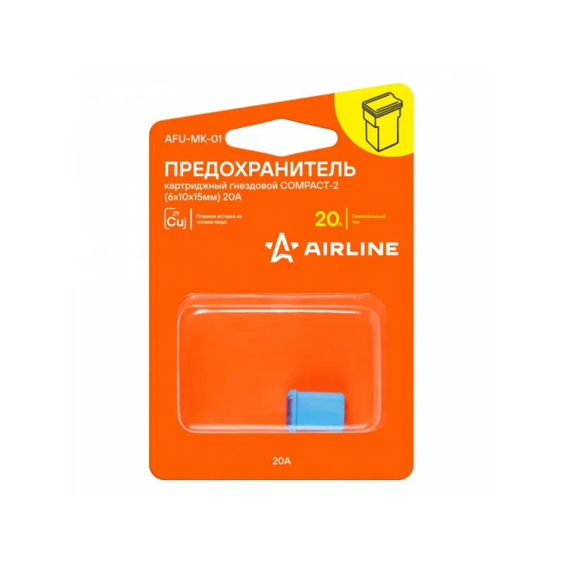 Предохранитель картриджный гнездовой COMPACT-2 (6x10x15мм) 20А в блистере 1шт. Описание: Картриджный предохранитель гнездовой COMPACT-2. Предназначен для защиты автомобильных электрических цепей и устройств в них от перегрузок и короткого замыкания. В предохранителях использована вставка из высококачественного сплава меди, которая в случае нештатной ситуации разомкнет неисправную электрическую цепь. Применяется преимущественно в иномарках. Благодаря своей надежности и долговечности предохранители AIRLINE обеспечивают безопасносную эксплуатацию автомобиля и позволяют избежать поломок, связанных с перегрузками или короткими замыканиями. Предохранитель для иномарок имеет стандартный типоразмер и легко устанавливается в штатное место в блоке предохранителей без необходимости специальных знаний и инструментов. Используйте предохранители AIRLINE для надежной защиты вашего автомобиля. Характеристики: Артикул: AFU-MK-01 Номинальное напряжение, В: 32 Номинальный ток, А: 20 Комплектация: Предохранитель - 1 шт Упаковка - 1 шт Гарантия: от 1 года.