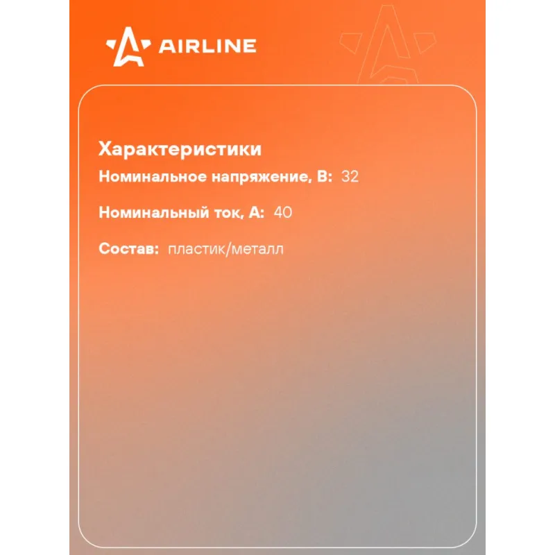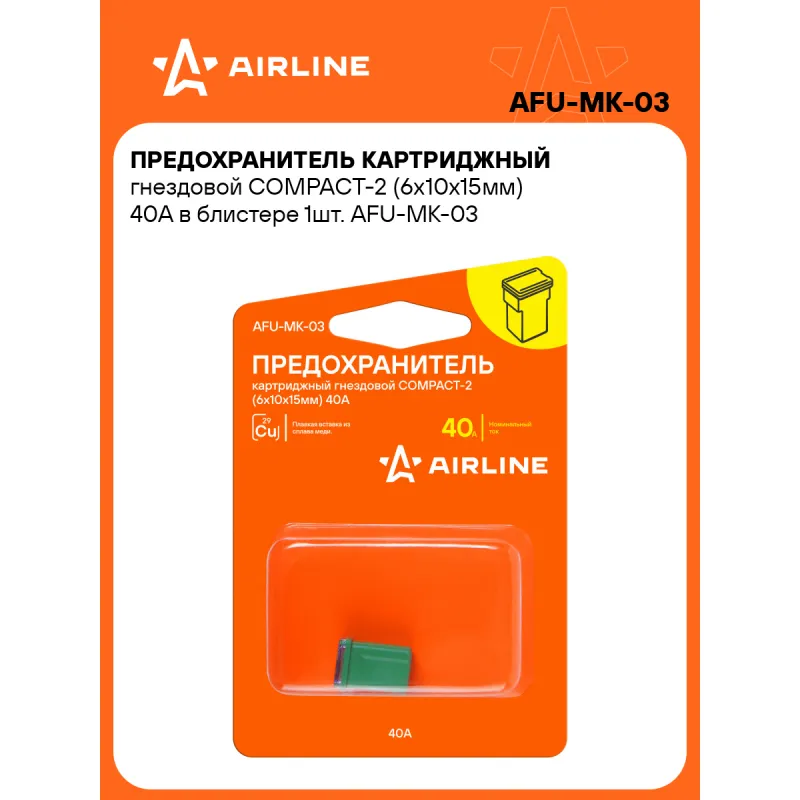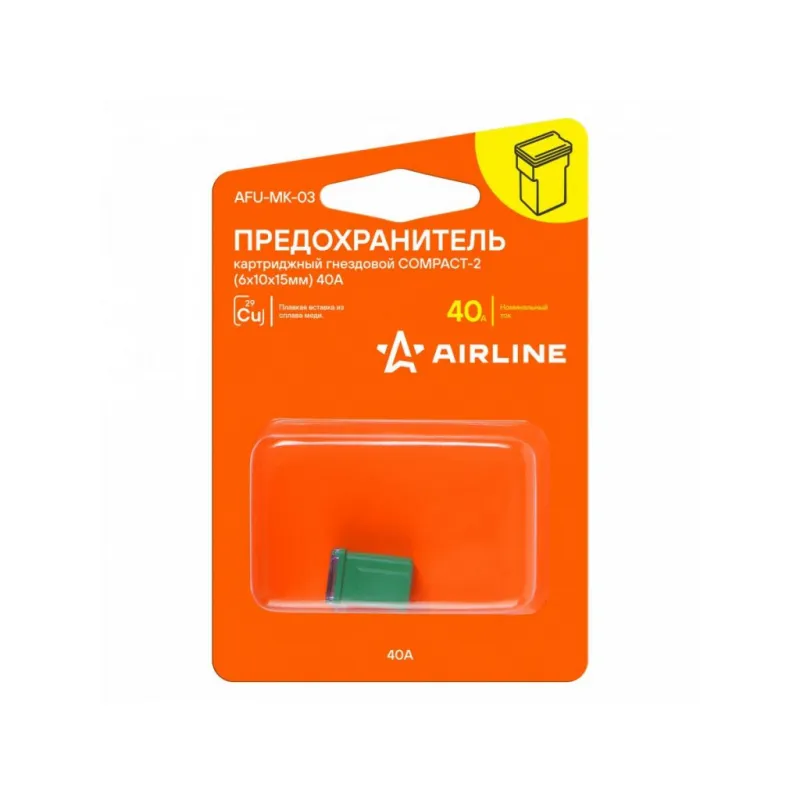 Предохранитель картриджный гнездовой COMPACT-2 (6x10x15мм) 40А в блистере 1шт. Описание: Картриджный предохранитель гнездовой COMPACT-2. Предназначен для защиты автомобильных электрических цепей и устройств в них от перегрузок и короткого замыкания. В предохранителях использована вставка из высококачественного сплава меди, которая в случае нештатной ситуации разомкнет неисправную электрическую цепь. Применяется преимущественно в иномарках. Благодаря своей надежности и долговечности предохранители AIRLINE обеспечивают безопасносную эксплуатацию автомобиля и позволяют избежать поломок, связанных с перегрузками или короткими замыканиями. Предохранитель для иномарок имеет стандартный типоразмер и легко устанавливается в штатное место в блоке предохранителей без необходимости специальных знаний и инструментов. Используйте предохранители AIRLINE для надежной защиты вашего автомобиля. Характеристики: Артикул: AFU-MK-03 Номинальное напряжение, В: 32 Номинальный ток, А: 40 Комплектация: Предохранитель - 1 шт Упаковка - 1 шт Гарантия: от 1 года.