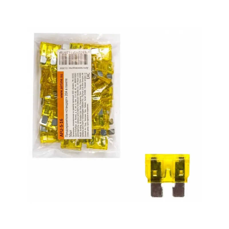 Предохранители "стандарт" 20A в пакете 50шт. Описание: Набор автомобильных предохранителей флажкового типа AFU-S-16, бренда Airline, предназначен для защиты автомобильной сети от скачков электричества. Автомобильные предохранители предназначены для любого вида транспорта. Состоят предохранители из плавкой вставки из надежного сплава цинка для защиты электрических цепей и оборудования автомобиля. В набор входят 50шт предохранителей одного номинала 20 А в пластиковом пакете. Набор флажковых предохранителей - это нужная вещь для каждого автомобилиста и надежный и необходимый товар для защиты вашего автомобиля будет полезным подарком для папы, мужа, парня и любому владельцу авто. В В нашем магазине представлены следующие автомобильные предохранители по габаритным размерам и конструктивным особенностям: микро (micro), микро 2 (micro2), мини (mini), стандарт (standard), макси (maxi). Подойдут для любой марки машины. Товар официального производителя AIRLINE. Характеристики: Артикул: AFU-S-16 OEM номера: N 017 131 13, 91837-21100 Номинальное напряжение, В: 32 Номинальный ток, А: 20 Комплектация: Предохранитель - 50 шт Гарантия: от 1 года.