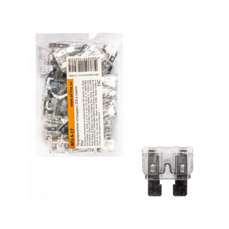 Предохранители "стандарт" 25A в пакете 50шт. Описание: Набор автомобильных предохранителей флажкового типа AFU-S-17, бренда Airline, предназначен для защиты автомобильной сети от скачков электричества. Автомобильные предохранители предназначены для любого вида транспорта. Состоят предохранители из плавкой вставки из надежного сплава цинка для защиты электрических цепей и оборудования автомобиля. В набор входят 50шт предохранителей одного номинала 25 А в пластиковом пакете. Набор флажковых предохранителей - это нужная вещь для каждого автомобилиста и надежный и необходимый товар для защиты вашего автомобиля будет полезным подарком для папы, мужа, парня и любому владельцу авто. В В нашем магазине представлены следующие автомобильные предохранители по габаритным размерам и конструктивным особенностям: микро (micro), микро 2 (micro2), мини (mini), стандарт (standard), макси (maxi). Подойдут для любой марки машины. Товар официального производителя AIRLINE. Характеристики: Артикул: AFU-S-17 OEM номера: N 017 131 14 Номинальное напряжение, В: 32 Номинальный ток, А: 25 Комплектация: Предохранитель - 50 шт Гарантия: от 1 года.