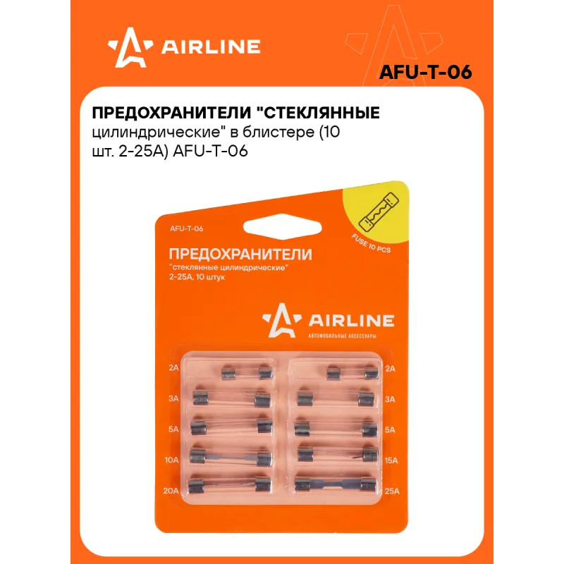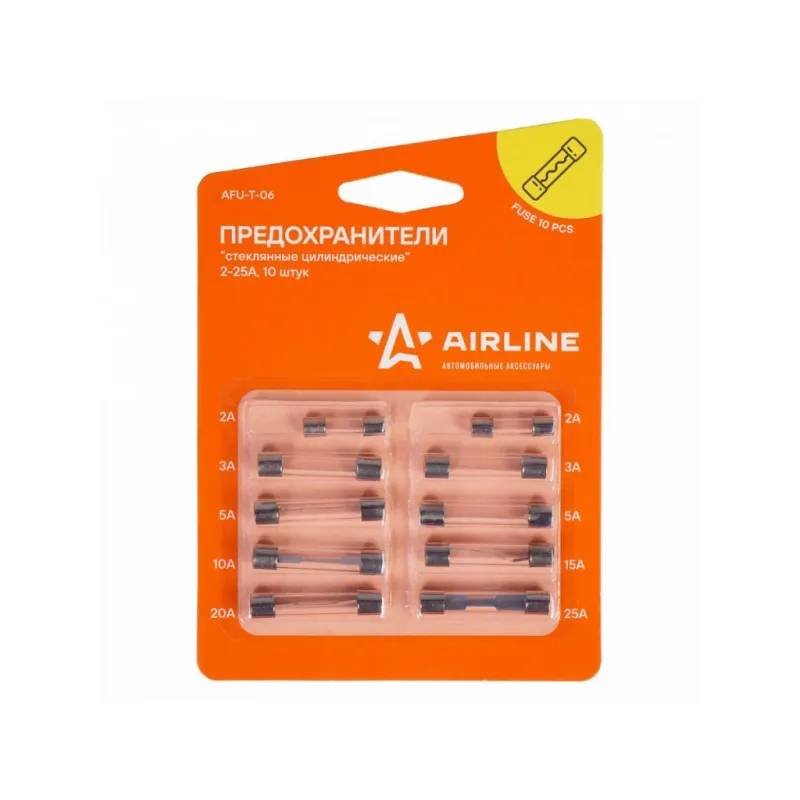 Предохранители "стеклянные цилиндрические" в блистере (10 шт. 2-25А) Описание: Набор автомобильных стеклянных предохранителей цилиндрического типа AFU-T-06, бренда Airline, предназначен для защиты автомобильной сети от скачков электричества. Автомобильные предохранители предназначены для любого вида транспорта. Состоят предохранители из плавкой вставки из надежного сплава цинка для защиты электрических цепей и оборудования автомобиля. В набор входят предохранители разного номинала: 2А - 2шт., 3А - 2шт., 5А - 2шт, 10А - 1шт., 15А - 1шт., 20А - 1шт, 25А - 1шт. и щипцы/экстрактор для замены предохранителей. В нашем магазине представлены следующие автомобильные предохранители по габаритным размерам и конструктивным особенностям: микро (micro), микро 2 (micro2), мини (mini), стандарт (standard), макси (maxi). Цветовая маркировка предохранителей служит для обозначения рейтинга номинального тока. Набор цилиндрических предохранителей - это нужная вещь для каждого автомобилиста и надежный и необходимый товар для защиты вашего автомобиля будет полезным подарком для папы, мужа, парня и любому владельцу авто. Подойдут для любой марки машины. Товар официального производителя AIRLINE. Характеристики: Артикул: AFU-T-06 Номинальное напряжение, В: 32 Номинальный ток, А: 2-25 Размер:: 2А: 5*20мм, 5/10/15/20/25А: 6*30мм Комплектация: Предохранители: 2А - 2шт., 3А - 2шт., 5А - 2шт, 10А - 1шт., 15А - 1шт., 20А - 1шт, 25А - 1шт Блистерная упаковка - 1 шт Гарантия: от 1 года.