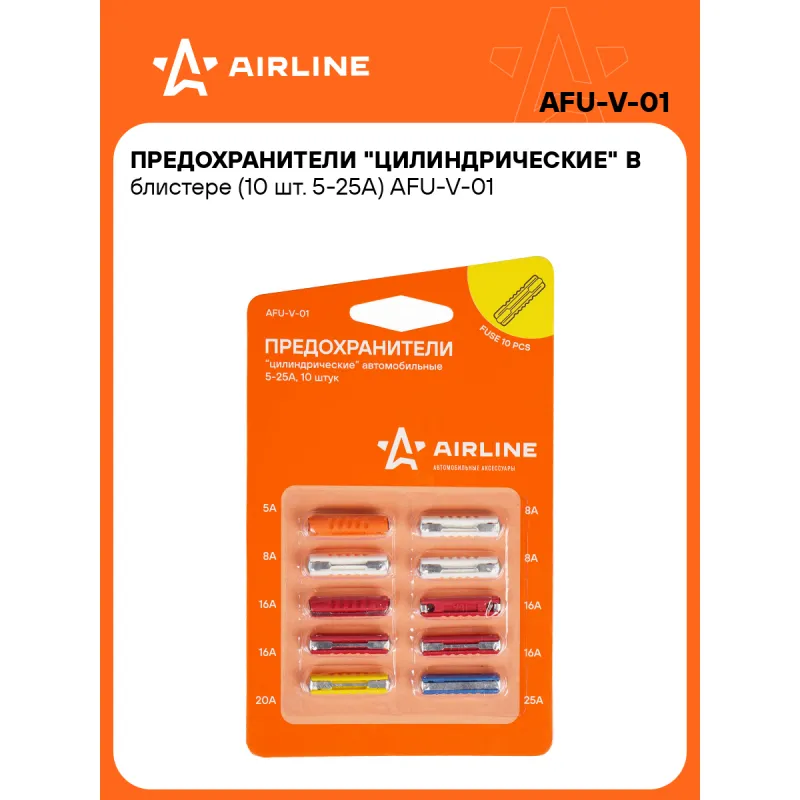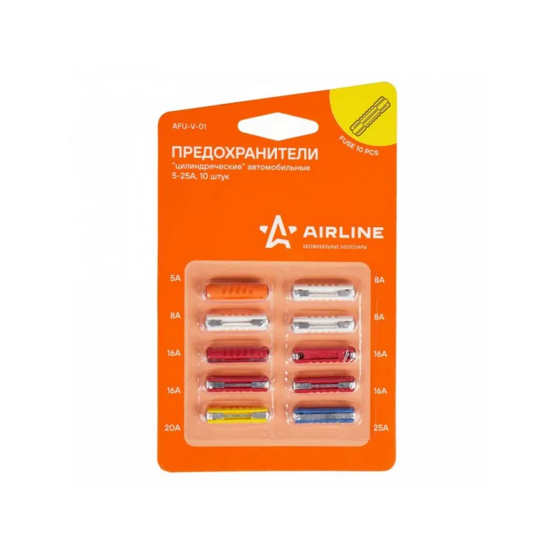 Предохранители "цилиндрические" в блистере (10 шт. 5-25А) Описание: Набор автомобильных предохранителей цилиндрического типа AFU-V-01, бренда Airline, предназначен для защиты автомобильной сети от скачков электричества. Автомобильные предохранители предназначены для любого вида транспорта. Состоят предохранители из плавкой вставки из надежного сплава цинка для защиты электрических цепей и оборудования автомобиля. В набор входят предохранители разного номинала: 5А - 2 шт., 8А - 2 шт., 16А - 2 шт., 20А - 2 шт., 25А - 2 шт. и щипцы/экстрактор для замены предохранителей. В нашем магазине представлены следующие автомобильные предохранители по габаритным размерам и конструктивным особенностям: микро (micro), микро 2 (micro2), мини (mini), стандарт (standard), макси (maxi). Цветовая маркировка предохранителей служит для обозначения рейтинга номинального тока. Набор цилиндрических предохранителей - это нужная вещь для каждого автомобилиста и надежный и необходимый товар для защиты вашего автомобиля будет полезным подарком для папы, мужа, парня и любому владельцу авто. Подойдут для любой марки машины. Товар официального производителя AIRLINE. Характеристики: Артикул: AFU-V-01 Номинальное напряжение, В: 32 Номинальный ток, А: 5-25 Комплектация: Предохранители: 5А - 2 шт., 8А - 2 шт., 16А - 2 шт., 20А - 2 шт., 25А - 2 шт. Блистерная упаковка - 1 шт Гарантия: от 1 года.
