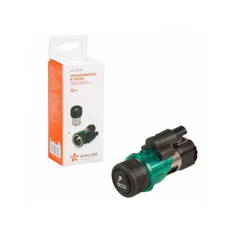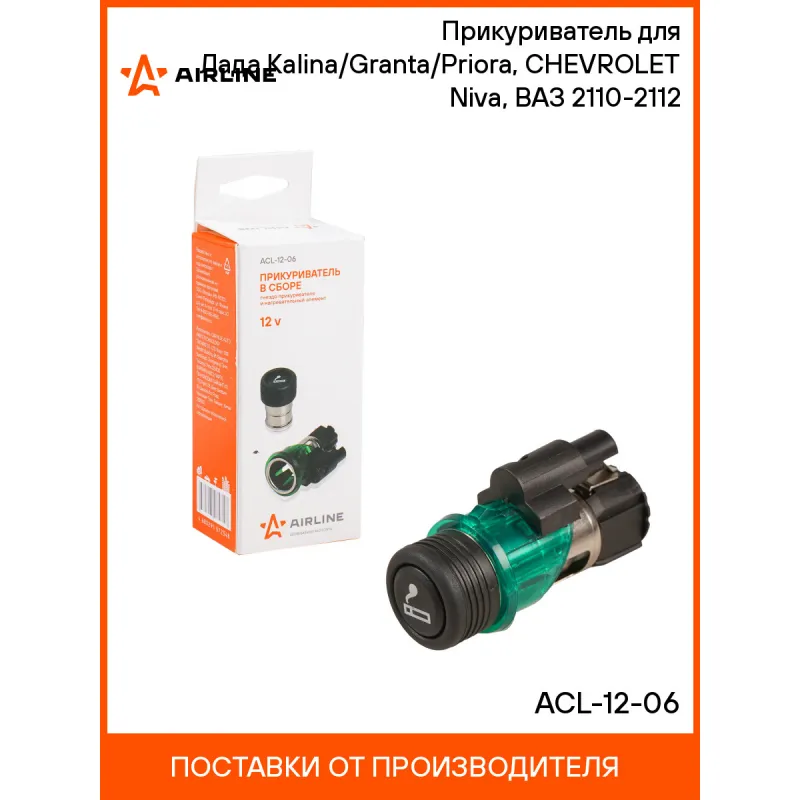 Прикуриватель для Лада Kalina/Granta/Priora, CHEVROLET Niva, ВАЗ 2110-2112 Описание: Прикуриватель в сборе бренда AIRLINE ACL-12-06, гнездо прикуривателя и нагревательный элемент, представляет собой стандартную автомобильную розетку и нагревательный элемент прикуривателя. Применяемость: Lada 2110, 2111, 2112, Lada Kalina 1117, 1118, 1119, Lada Priora 2170, 2171, 2172, Lada Granta 2190, 2191, 2192, Lada Chevrolet Niva 2123, ВАЗ 2110-2112; Особенности устройства: * Состав: металл/пластик; * Номинальное напряжение, 12 В; Прикуриватель для авто - товар официального производителя AIRLINE. Прикуриватель в автомобильный салон подойдет для замены оригинального прикуривателя в случае его неисправности. Если Вам потребуется помощь в подборе, мы всегда готовы ответить на Ваши вопросы. Характеристики: Артикул: ACL-12-06 Напряжение питания, В: 12 Комплектация: Розетка прикуривателя - 1 шт Нагревательный элемент - 1 шт Гарантия: от 1 года.