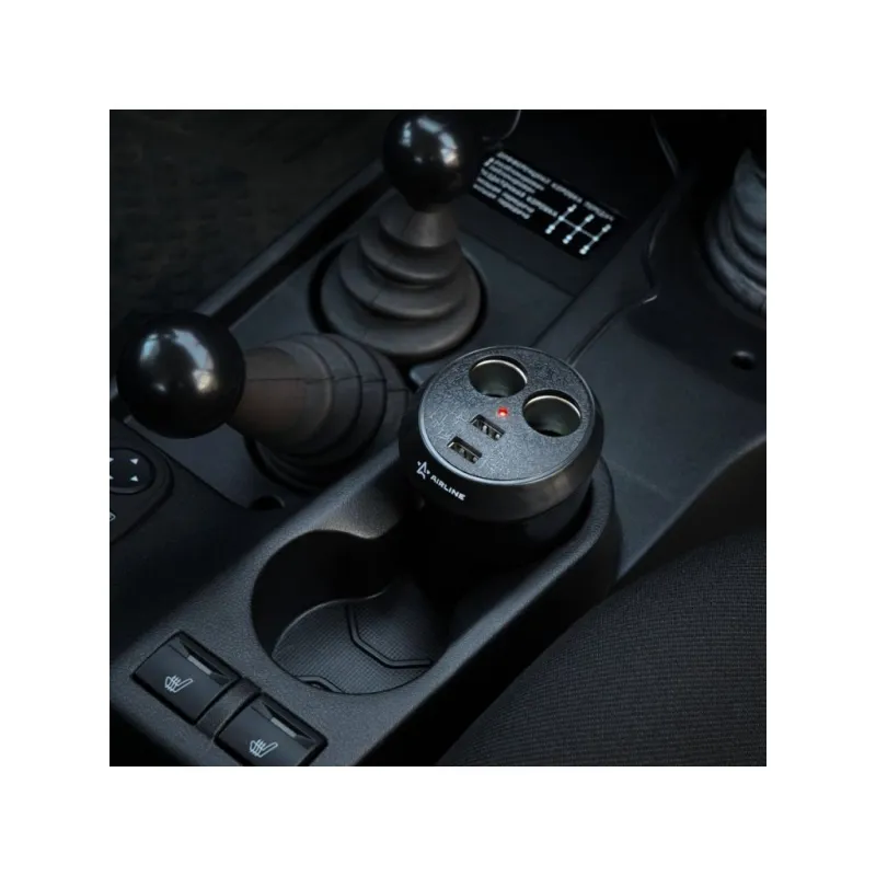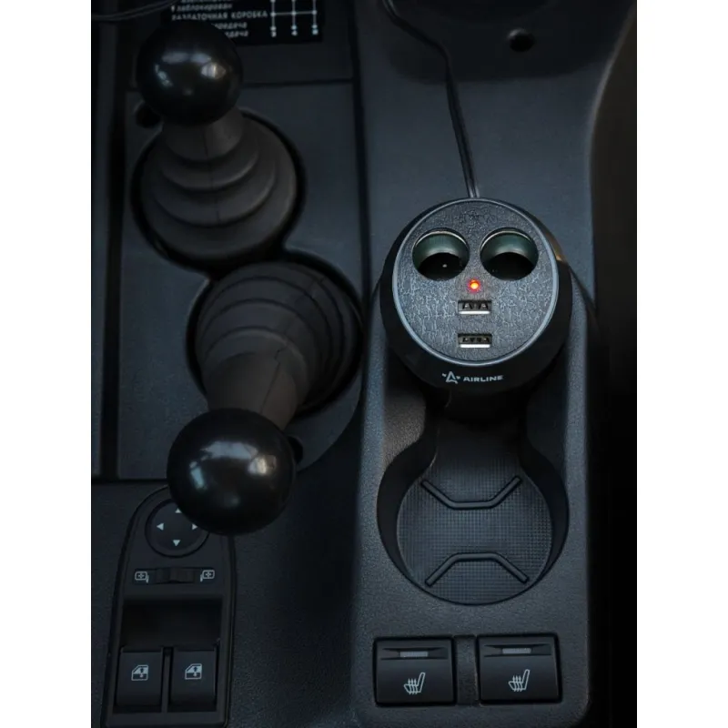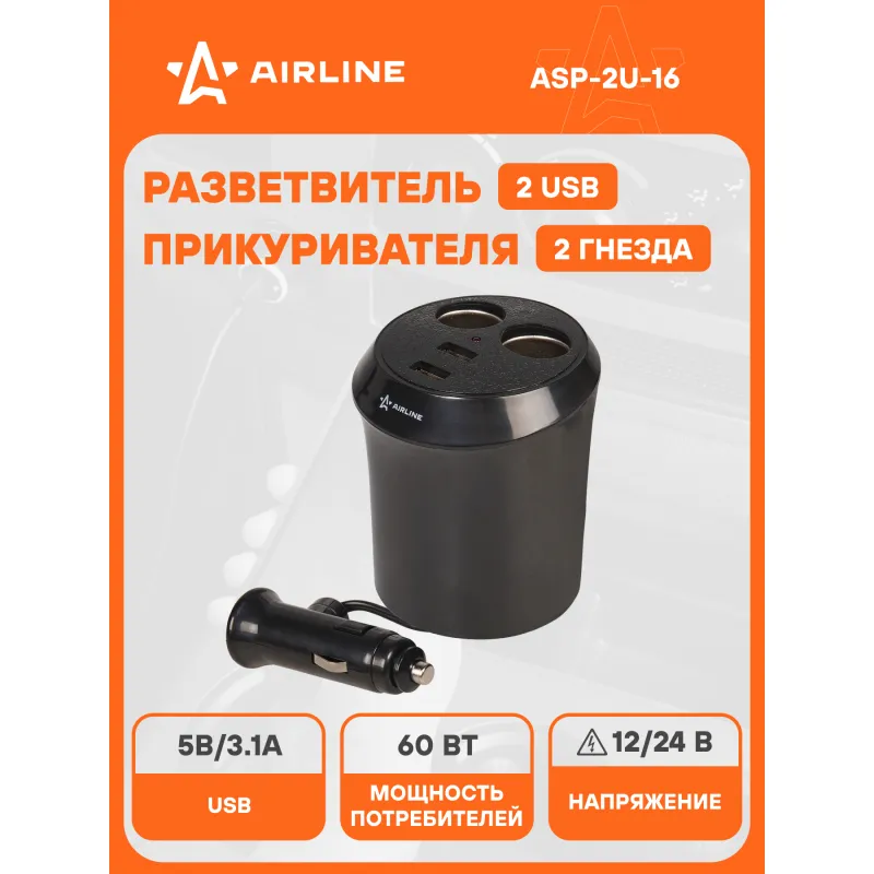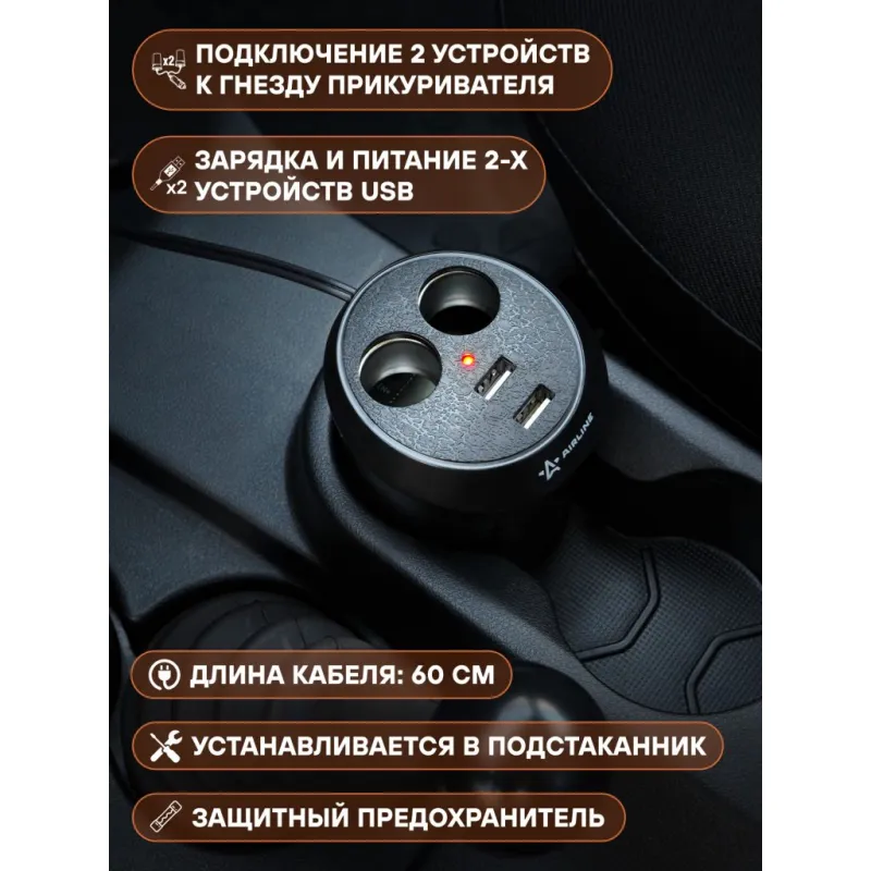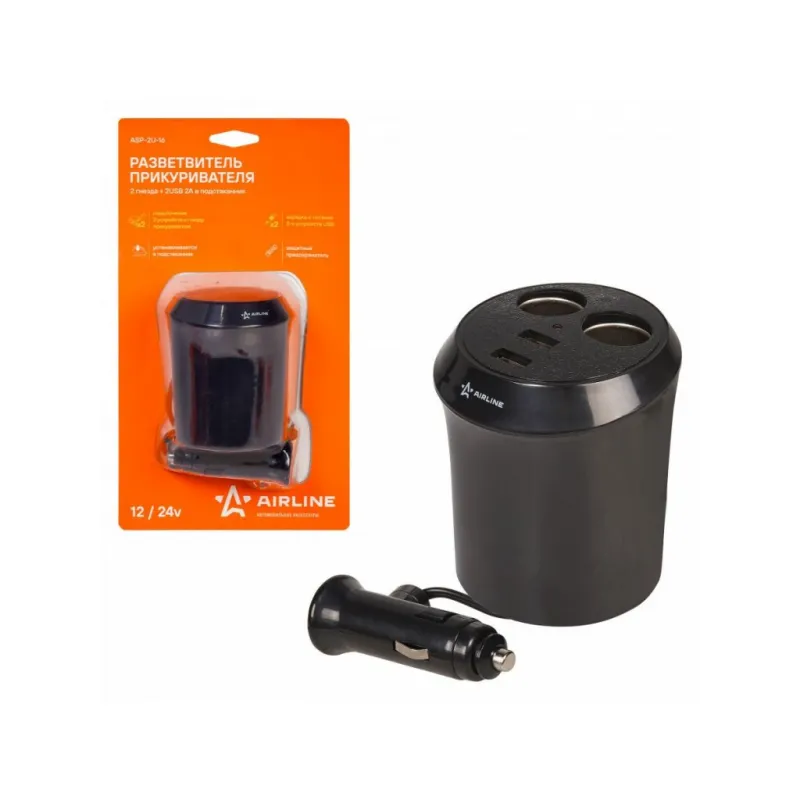 Разветвитель прикуривателя 2 гнезда 5А + 2USB в подстаканник Описание: Разветвитель прикуривателя автомобильный на 2 гнезда + 2 USB в подстаканник ASP-2U-16 от бренда AIRLINE предназначены для подключения нескольких устройств (мобильные телефоны, зарядка для ноутбука, радар-детекторы и т.д.) к бортовой сети автомобиля. Модель выполнена из качественного пластика. Особенности устройства: * Подключение двух устройств к гнезду прикуривателя; * Защитный предохранитель; * Зарядка и питание двух устройств USB; * Максимальный выходной ток, 8 А; * Длина кабеля (включая штекер), 60 см; * Диаметр 80 мм, высота 90 мм; * Устанавливается в подстаканник; * Суммарная мощность потребителей, 60 Вт; * Параметры USB 5В/3.1А; * Максимальный выходной ток, 5 А; * Номинальное напряжение, 12/24 В; Розетка разветвитель в прикуриватель - товар официального производителя AIRLINE. Разветвители прикуривателя для авто - это незаменимый помощник во время поездок на автомобиле, кемпинга, повседневных нужд, так как служит как дополнительная розетка автомобильного прикуривателя. Характеристики: Артикул: ASP-2U-16 Параметры USB: 5В/3,1А Длина кабеля (включая штекер), см: 60 Максимальный выходной ток, А: 5 Суммарная мощность потребителей, Вт: 60 Номинальное напряжение, В: 12/24 Комплектация: Разветвитель прикуривателя в блистере - 1 шт Гарантия: от 1 года.