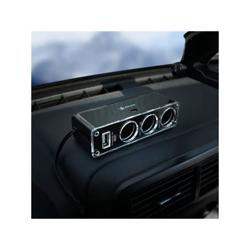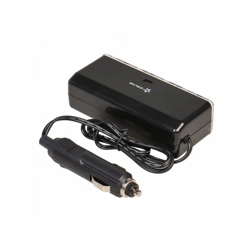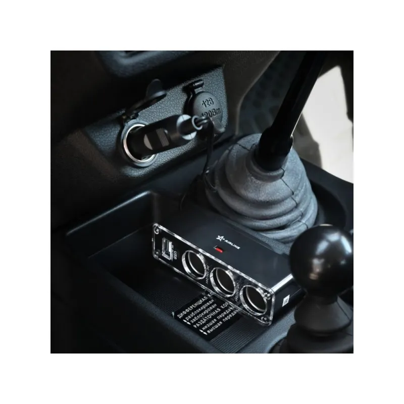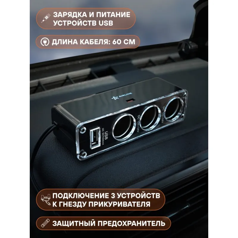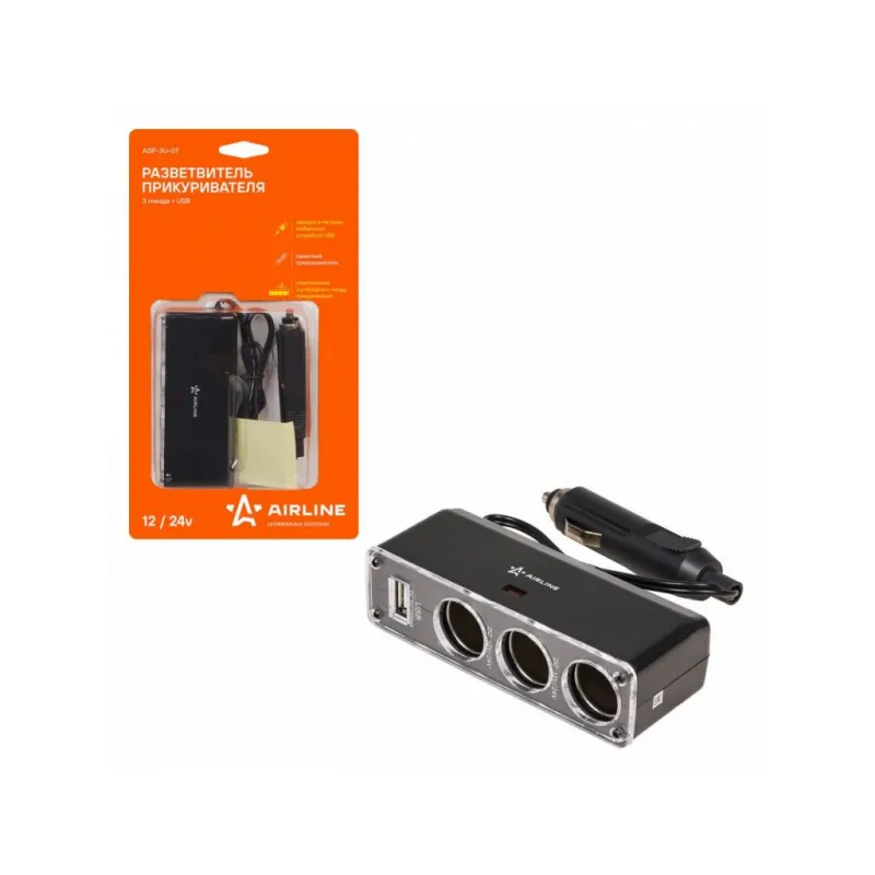 Разветвитель прикуривателя 3 гнезда 5А + USB (черный) Описание: Разветвитель прикуривателя автомобильный на 3 гнезда + USB ASP-3U-07 от бренда AIRLINE предназначены для подключения нескольких устройств (мобильные телефоны, зарядка для ноутбука, радар-детекторы и т.д.) к бортовой сети автомобиля. Модель выполнена из качественного пластика. Особенности устройства: * Универсальный штекер; * Подключение трех устройств к гнезду прикуривателя + USB; * Защитный предохранитель; * Зарядка и питание мобильных устройств USB; * Максимальный выходной ток, 5 А; * Суммарная мощность потребителей, 60 Вт; * Длина кабеля (включая штекер), 60 см; * Параметры USB 5В/1000 мА; * Номинальное напряжение, 12/24 В; * Корпус розетки изготовлен из ударопрочного пластика. Розетка разветвитель в прикуриватель - товар официального производителя AIRLINE. Разветвители прикуривателя для авто - это незаменимый помощник во время поездок на автомобиле, кемпинга, повседневных нужд, так как служит как дополнительная розетка автомобильного прикуривателя. Характеристики: Артикул: ASP-3U-07 Параметры USB: 5В/500мА Длина кабеля (включая штекер), см: 60 Максимальный выходной ток, А: 5 Суммарная мощность потребителей, Вт: 60 Номинальное напряжение, В: 12/24 Комплектация: Разветвитель прикуривателя в блистере - 1 шт Гарантия: от 1 года.
