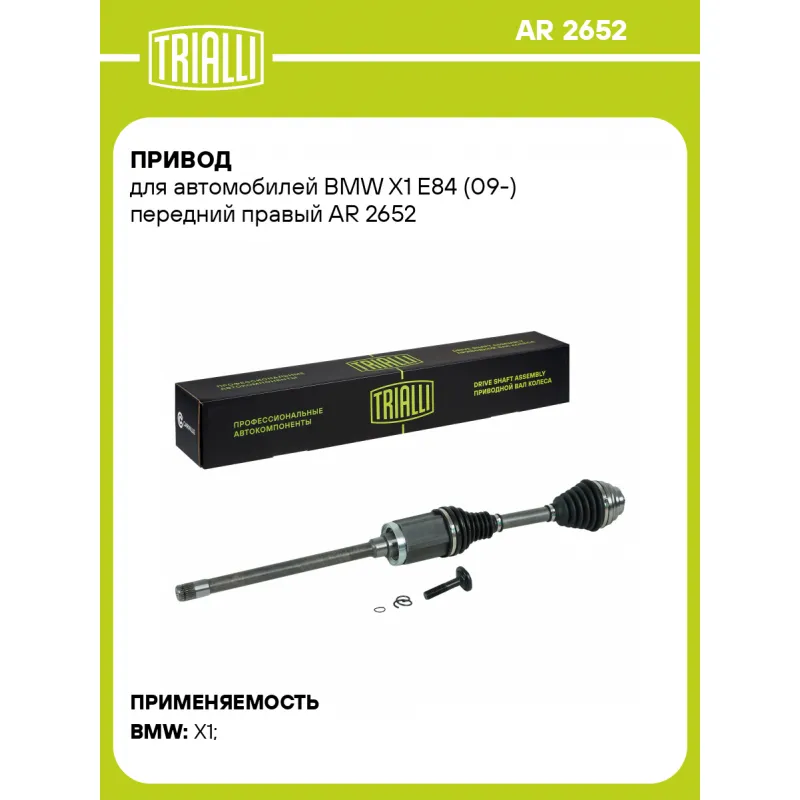 Привод для автомобилей BMW X1 E84 (09-) передний правый Характеристики: Артикул: AR 2652 OEM номера: 31607605512, 31607591682 Ось (сторона установки): передняя, правый Длина, мм: 822 Внешнее зубчатое соединение со стороны КПП (внутр.): 27 Внешнее зубчатое соединение со стороны колеса (внеш.): 31 Тип КПП: AT Гарантийный срок: 2 года/60 000 км Сопутствующий товар: Приводы: AR 2653, AR 2654, AR 2655 Парный товар: AR 2653 Количество на автомобиль: 1 Товарная линейка: BLACK Комплектация: Привод в сборе - 1 шт Пружина - 1 шт Болт - 1 шт Гарантия: от 1 года.
