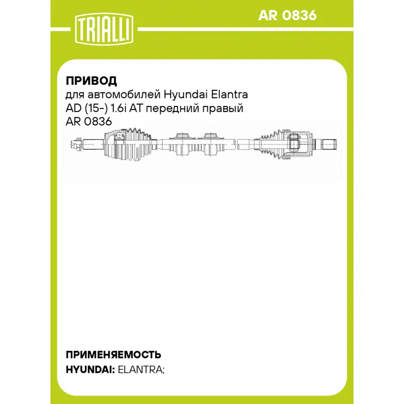 Привод для автомобилей Hyundai Elantra AD (15-) 1.6i AT передний правый Характеристики: Артикул: AR 0836 OEM номера: 49501F2100, 49501M6200 Ось (сторона установки): передняя, правая Длина, мм: 955 Внешнее зубчатое соединение со стороны КПП (внутр.): 27 Внешнее зубчатое соединение со стороны колеса (внеш.): 27 Диаметр вала,мм: 29 Тип КПП: AT Гарантийный срок: 2 года/60 000 км Сопутствующий товар: Приводы: AR 0835 Парный товар: AR 0835 Количество на автомобиль: 1 Товарная линейка: BLACK Комплектация: Гайка - 1 шт Привод в сборе - 1 шт Гарантия: от 1 года.