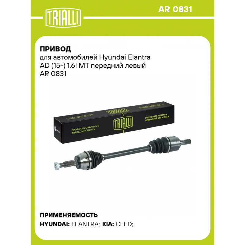 Привод для автомобилей Hyundai Elantra AD (15-) 1.6i MT передний левый Характеристики: Артикул: AR 0831 OEM номера: 49500G4500, 49500F2000 Ось (сторона установки): передняя, левая Длина, мм: 685 Внешнее зубчатое соединение со стороны КПП (внутр.): 25 Внешнее зубчатое соединение со стороны колеса (внеш.): 27 Диаметр вала,мм: 26,5 Тип КПП: МТ Гарантийный срок: 2 года/60 000 км Сопутствующий товар: Приводы: AR 0832 Парный товар: AR 0832 Количество на автомобиль: 1 Товарная линейка: BLACK Комплектация: Привод в сборе - 1 шт Гайка - 1 шт Гарантия: от 1 года.