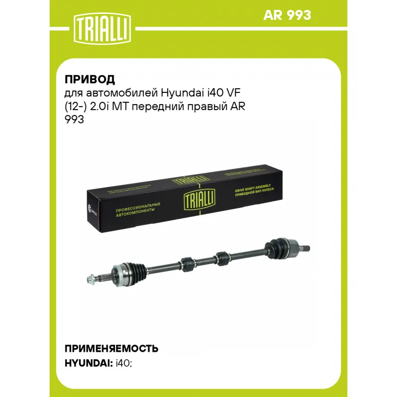 Привод для автомобилей Hyundai i40 VF (12-) 2.0i MT передний правый Характеристики: Артикул: AR 993 OEM номера: 49501-3Z150, 495013Z350 Особенности конструкции:: с демпфером Ось (сторона установки): передняя, правая Длина, мм: 983 Внешнее зубчатое соединение со стороны КПП (внутр.): 27 Количество зубьев ABS: 48 Внешнее зубчатое соединение со стороны колеса (внеш.): 27 Диаметр вала,мм: 28 Тип КПП: МТ Гарантийный срок: 2 года/60 000 км Сопутствующий товар: Приводы: AR 992 Парный товар: AR 992 Количество на автомобиль: 1 Товарная линейка: BLACK Комплектация: Гайка - 1 шт Привод в сборе - 1 шт Гарантия: от 1 года.