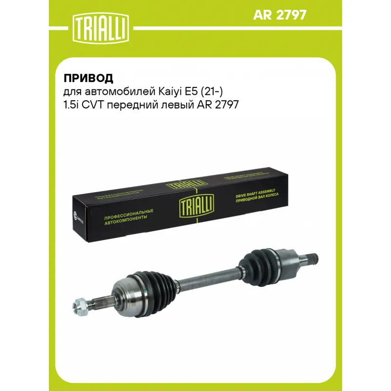 Привод для автомобилей Kaiyi E5 (21-) 1.5i CVT передний левый Характеристики: Артикул: AR 2797 OEM номера: 154000094AA Ось (сторона установки): передняя, левая Длина, мм: 651 Внешнее зубчатое соединение со стороны КПП (внутр.): 27 Внешнее зубчатое соединение со стороны колеса (внеш.): 26 Диаметр вала,мм: 29 Тип КПП: CVT Гарантийный срок: 2 года/60 000 км Сопутствующий товар: Приводы: AR 2796 Парный товар: AR 2796 Количество на автомобиль: 1 Товарная линейка: BLACK Комплектация: Привод в сборе - 1 шт Гайка - 1 шт Гарантия: от 1 года.