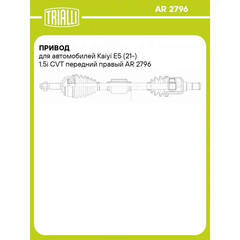 Привод для автомобилей Kaiyi E5 (21-) 1.5i CVT передний правый Характеристики: Артикул: AR 2796 OEM номера: 154000095AA Особенности конструкции:: с демпфером Ось (сторона установки): передняя, правый Длина, мм: 967 Внешнее зубчатое соединение со стороны КПП (внутр.): 27 Внешнее зубчатое соединение со стороны колеса (внеш.): 26 Диаметр вала,мм: 29 Тип КПП: CVT Гарантийный срок: 2 года/60 000 км Сопутствующий товар: Приводы: AR 2797 Парный товар: AR 2797 Количество на автомобиль: 1 Товарная линейка: BLACK Комплектация: Привод в сборе - 1 шт Гайка - 1 шт Гарантия: от 1 года.