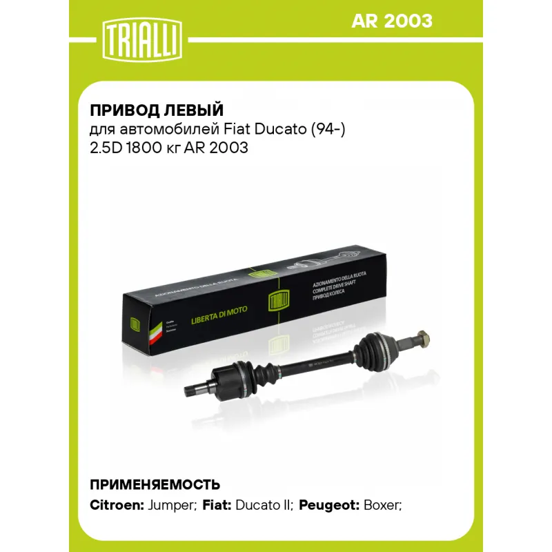 Привод левый для автомобилей Fiat Ducato (94-) 2.5D 1800 кг Характеристики: Артикул: AR 2003 OEM номера: 1495541080, 1491243080, 1495545080 Особенности конструкции:: радиус колеса R16 Гарантийный срок: 2 года/60 000 км Количество на автомобиль: 1 Ось (сторона установки): передняя/левая Внешнее зубчатое соединение со стороны колеса (внеш.): 35 Внешнее зубчатое соединение со стороны КПП (внутр.): 41 Количество зубьев ABS: 54 Длина, мм: 753 Диаметр вала,мм: 35 Тип КПП: MT Сопутствующий товар: ШРУСы: GO 2013 Сопутствующий товар: Приводы: AR 2004 Товарная линейка: BLACK Подходит для авто: Citroen Jumper (94-), Jumper (94-) Fiat Ducato II (94-), Ducato II (94-) Peugeot Boxer (94-) Для проверки применяемости отправьте VIN автомобиля через вкладку "Есть вопросы о товаре?" Комплектация: Привод в сборе - 1 шт Гарантийный талон - 1 шт Гарантия: от 1 года.