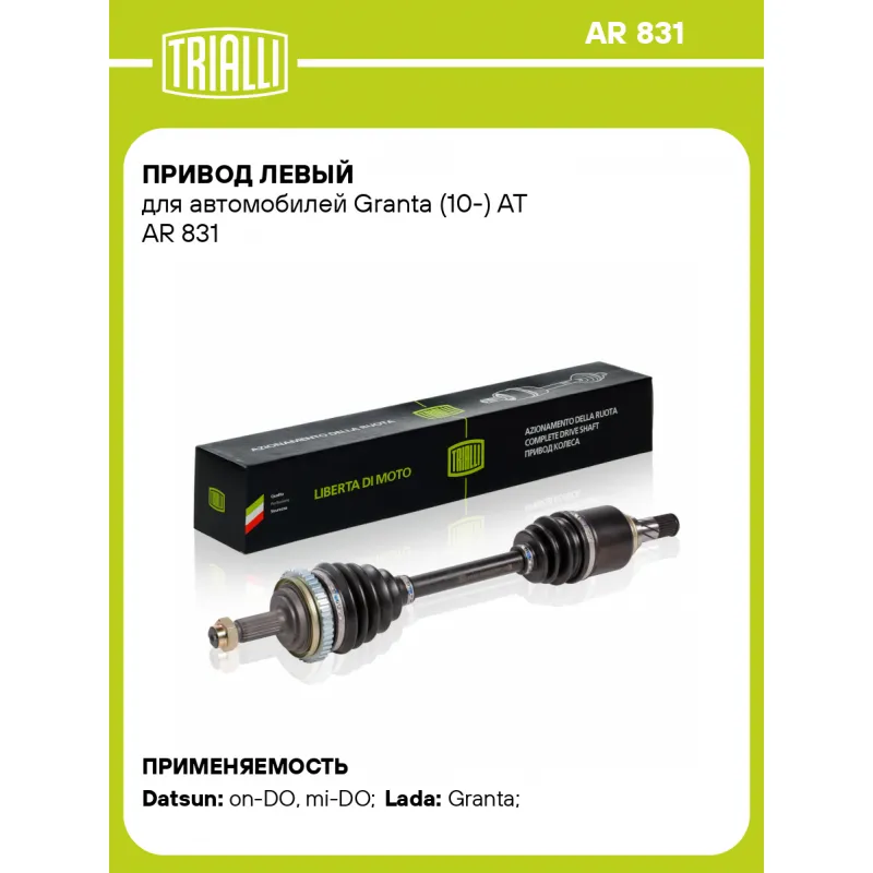 Привод левый для автомобилей Granta (10-) AT Характеристики: Артикул: AR 831 OEM номера: 21902-2215011-10 Сопутствующие товары:: AR 830, GO 424, GO 294 Особенности конструкции:: C ABS (трипойдная конструкция) Гарантийный срок: 2 года/60 000 км Парный товар: AR 830 Количество на автомобиль: 1 Ось (сторона установки): передняя, левая Внешнее зубчатое соединение со стороны колеса (внеш.): 22 Внешнее зубчатое соединение со стороны КПП (внутр.): 25 Количество зубьев ABS: 43 Длина, мм: 568.5 Диаметр вала,мм: 23 Тип КПП: AT Товарная линейка: BLACK КПП: Jatco (Nissan) JF414E Подходит для авто: Datsun on-DO (14-), mi-DO (15-) ВАЗ Granta (10-) Для проверки применяемости отправьте VIN автомобиля через вкладку "Есть вопросы о товаре?" Комплектация: Привод в сборе - 1 шт Гарантийный талон - 1 шт Гарантия: от 1 года.
