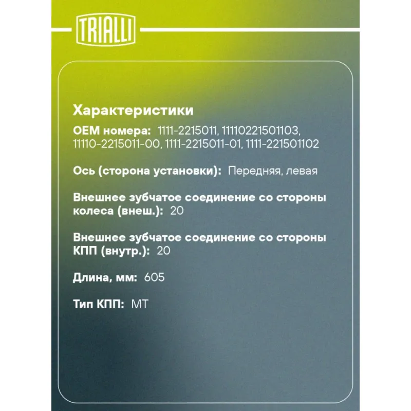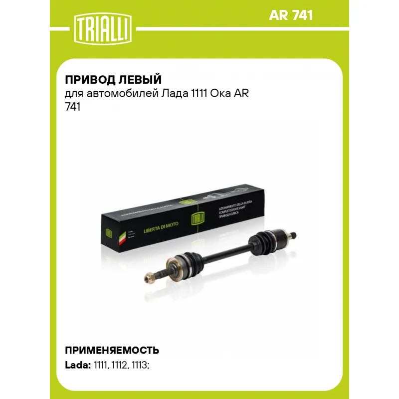 Привод левый для автомобилей Лада 1111 Ока Характеристики: Артикул: AR 741 OEM номера: 1111-2215011, 11110221501103, 11110-2215011-00, 1111-2215011-01, 1111-221501102 Сопутствующие товары:: GO 233,GO 435,GO 434 Особенности конструкции:: Внутренний шрус трипойдной конструкции Гарантийный срок: 2 года/60 000 км Парный товар: AR 740 Количество на автомобиль: 1 Ось (сторона установки): передняя, левая Внешнее зубчатое соединение со стороны колеса (внеш.): 20 Внешнее зубчатое соединение со стороны КПП (внутр.): 20 Длина, мм: 605 Диаметр вала,мм: 20,5 Тип КПП: MT Товарная линейка: BLACK Подходит для авто: ВАЗ 1111 (Ока), 1112, 1113 Для проверки применяемости отправьте VIN автомобиля через вкладку "Есть вопросы о товаре?" Комплектация: Привод в сборе - 1 шт Гайка - 1 шт Гарантия: от 1 года.