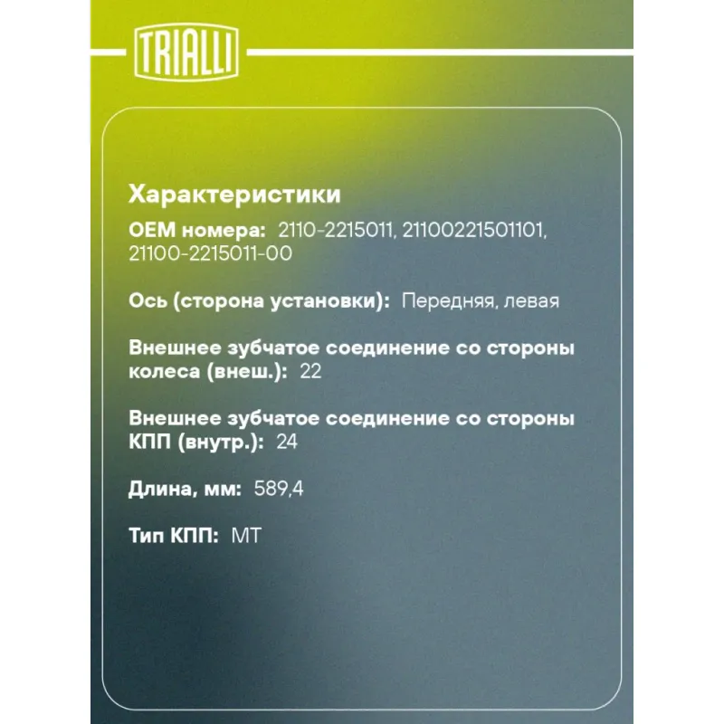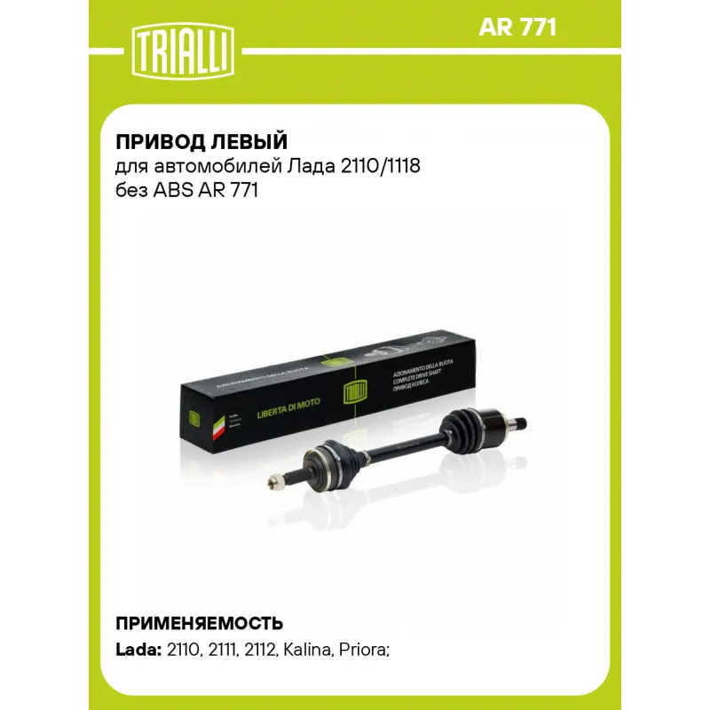 Привод левый для автомобилей Лада 2110/1118 без ABS Характеристики: Артикул: AR 771 OEM номера: 2110-2215011, 21100221501101, 21100-2215011-00 Гарантийный срок: 2 года/60 000 км Количество на автомобиль: 1 Ось (сторона установки): передняя, левая Внешнее зубчатое соединение со стороны колеса (внеш.): 22 Внешнее зубчатое соединение со стороны КПП (внутр.): 24 Длина, мм: 589.4 Тип КПП: MT Товарная линейка: BLACK Подходит для авто: ВАЗ 2110, 2111, 2111, 2112, 2112, Kalina (04-), 2110, 2111, 2112, Priora (07-), Kalina (04-) Для проверки применяемости отправьте VIN автомобиля через вкладку "Есть вопросы о товаре?" Комплектация: Привод в сборе - 1 шт Гарантийный талон - 1 шт Гарантия: от 1 года.