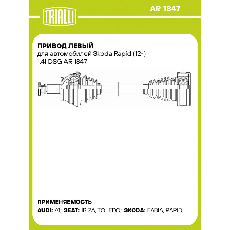 Привод левый для автомобилей Skoda Rapid (12-) 1.4i DSG Характеристики: Артикул: AR 1847 OEM номера: 6R0407761BX, 6R0407761B Ось (сторона установки): передняя, левая Длина, мм: 492 Внешнее зубчатое соединение со стороны колеса (внеш.): 36 Тип КПП: AMT Гарантийный срок: 2 года/60 000 км Сопутствующий товар: ШРУСы: GO 1846 Сопутствующий товар: Приводы: AR 1848 Количество на автомобиль: 1 Товарная линейка: BLACK Комплектация: Привод в сборе - 1 шт Болт - 6 шт Гайка - 1 шт Гарантия: от 1 года.