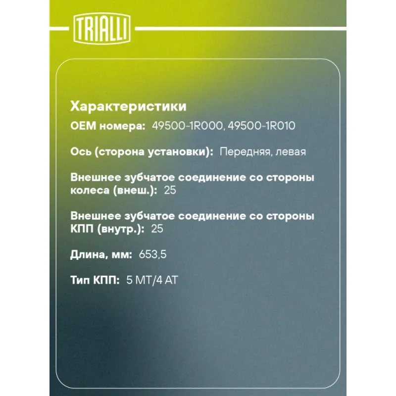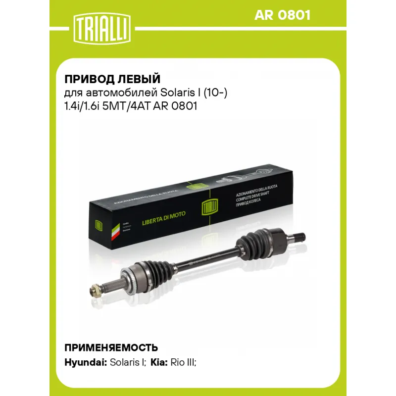 Привод левый для автомобилей Solaris I (10-) 1.4i/1.6i 5MT/4AT Характеристики: Артикул: AR 0801 OEM номера: 49500-1R000, 49500-1R010 Гарантийный срок: 2 года/60 000 км Парный товар: AR 0802 Количество на автомобиль: 1 Ось (сторона установки): передняя, левая Внешнее зубчатое соединение со стороны колеса (внеш.): 25 Внешнее зубчатое соединение со стороны КПП (внутр.): 25 Количество зубьев ABS: 48 Длина, мм: 653.5 Тип КПП: 5 MT/4 AT Товарная линейка: BLACK КПП: 5MT/4AT Подходит для авто: Hyundai Solaris I (10-) Kia Rio III (11-) Для проверки применяемости отправьте VIN автомобиля через вкладку "Есть вопросы о товаре?" Комплектация: Привод в сборе - 1 шт Гайка - 1 шт Гарантия: от 1 года.